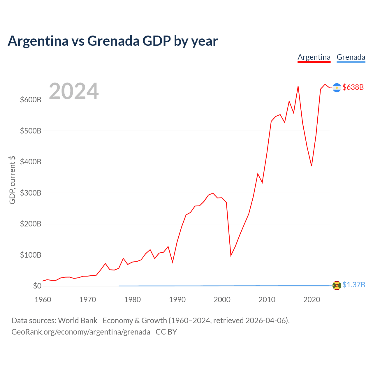 Argentina has a GDP of $638B compared to $1.37B for Grenada, ranking 24/197 and 184/197 by economy size, respectively.
