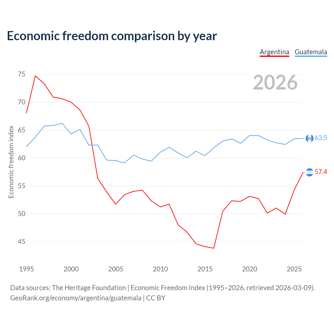 The Economic Freedom Index for Argentina is 57.4, ranking 117/197, compared to 63.5 for Guatemala, ranking 79/197. The chart above displays a comparison of annual changes in economic freedom indexes.