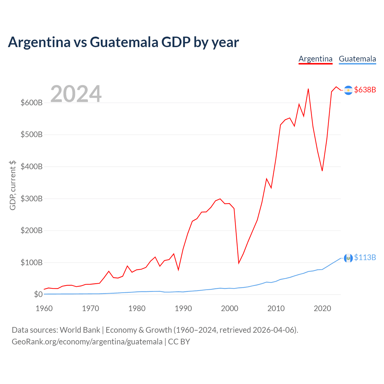 Argentina has a GDP of $638B compared to $113B for Guatemala, ranking 24/197 and 68/197 by economy size, respectively.