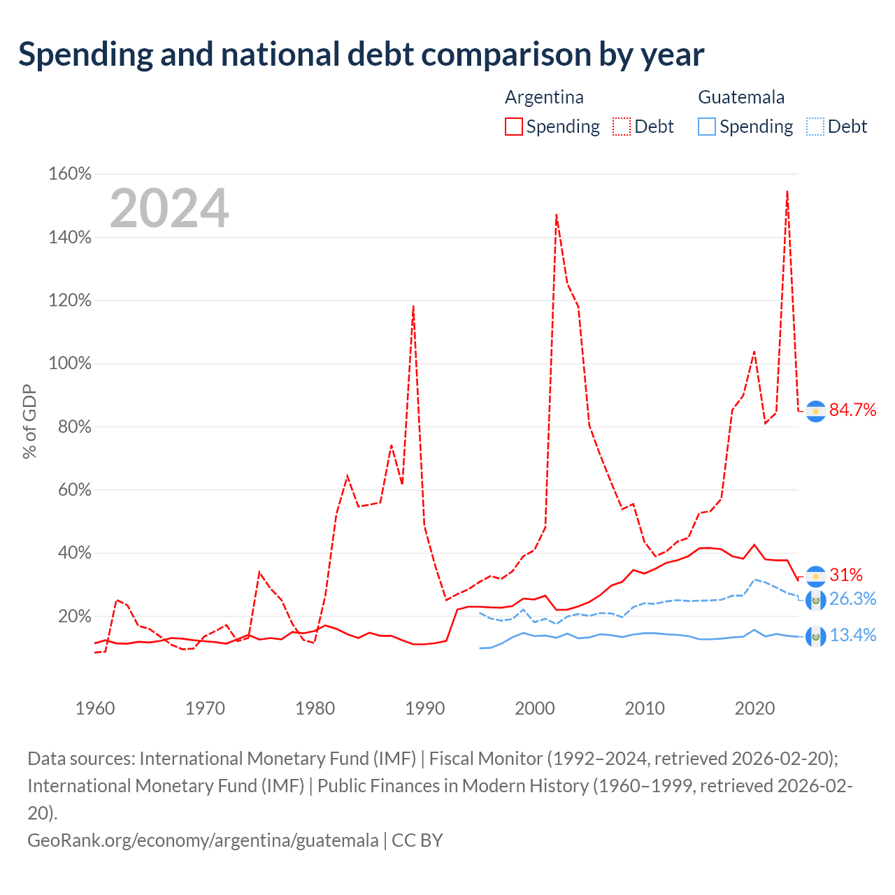 Argentina has $540B in government debt (84.7% of GDP), compared to $29.8B (26.3% of GDP) in Guatemala.