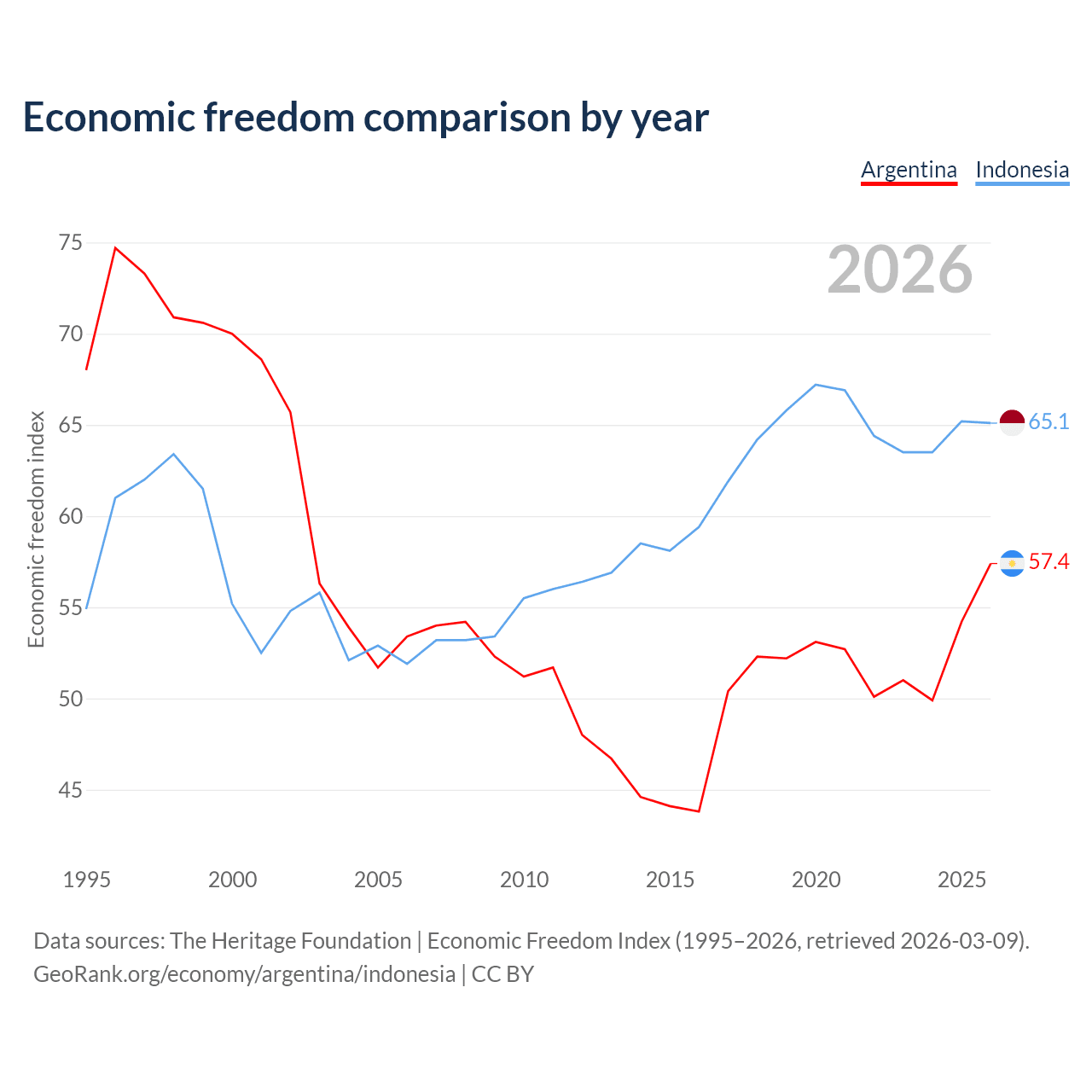 The Economic Freedom Index for Argentina is 57.4, ranking 117/197, compared to 65.1 for Indonesia, ranking 67/197. The chart above displays a comparison of annual changes in economic freedom indexes.