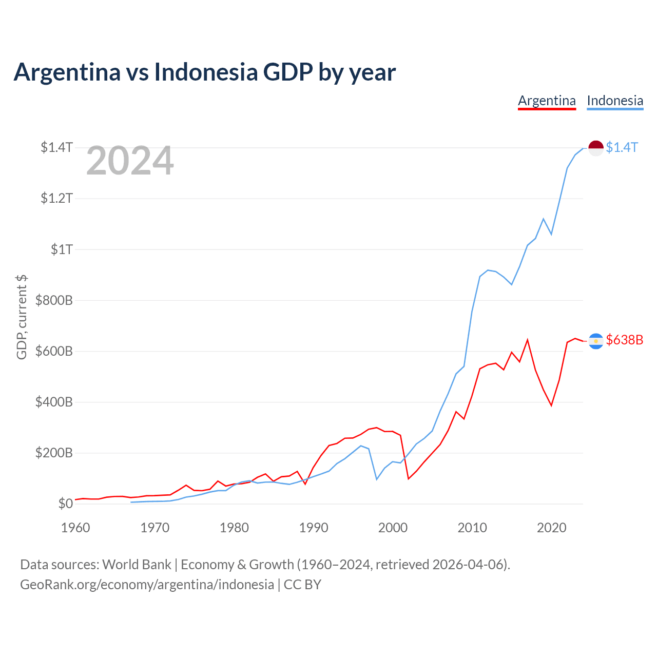 Argentina has a GDP of $638B compared to $1.4T for Indonesia, ranking 24/197 and 16/197 by economy size, respectively.
