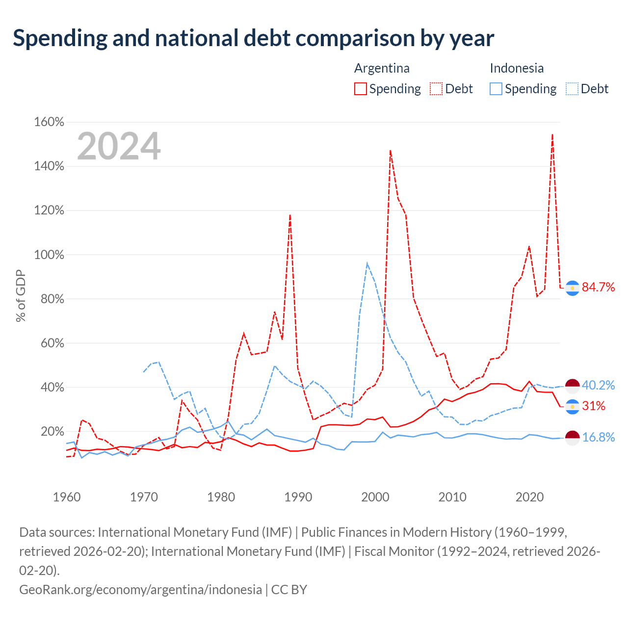 Argentina has $540B in government debt (84.7% of GDP), compared to $561B (40.2% of GDP) in Indonesia.