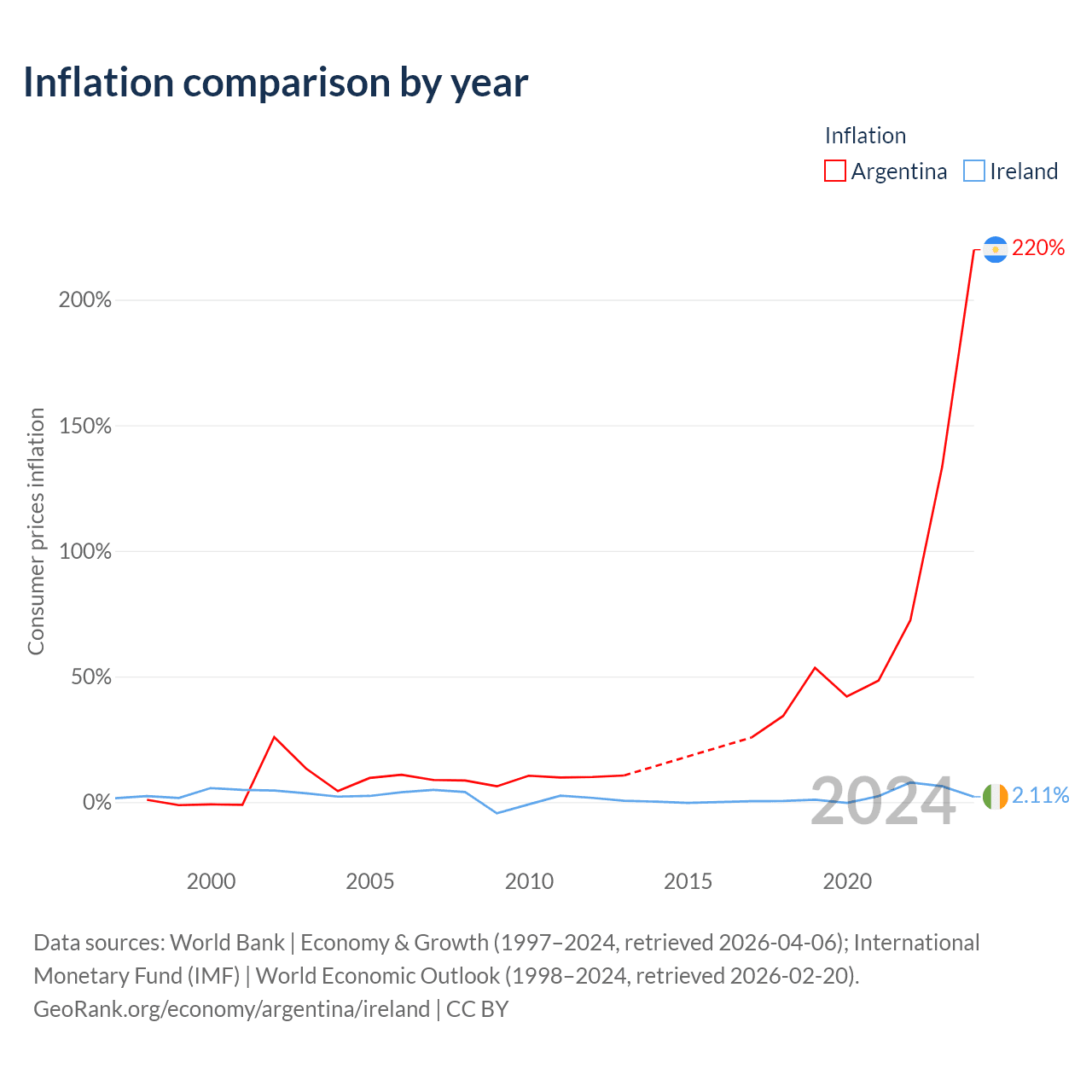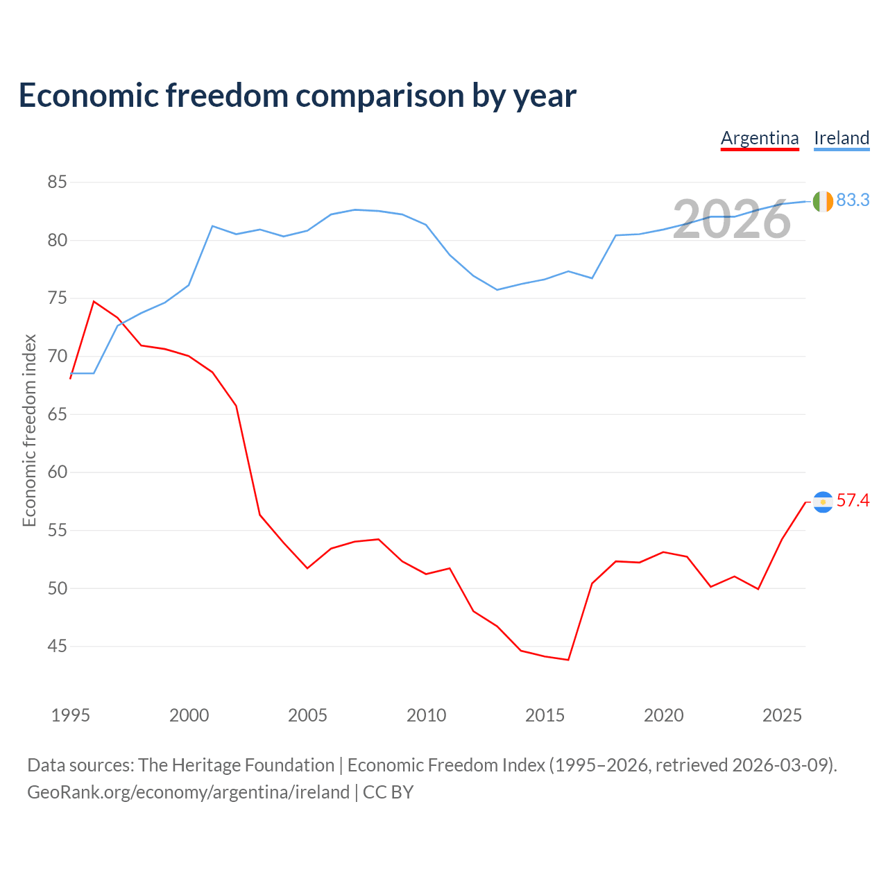 The Economic Freedom Index for Argentina is 57.4, ranking 117/197, compared to 83.3 for Ireland, ranking 3/197. The chart above displays a comparison of annual changes in economic freedom indexes.