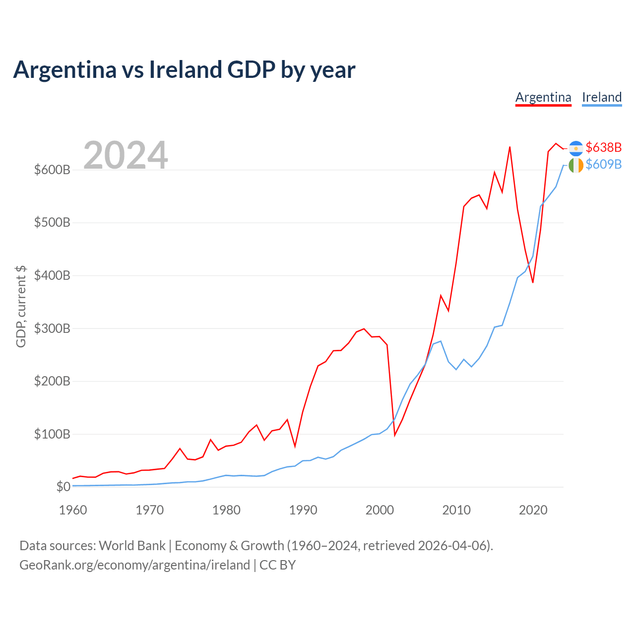 Argentina has a GDP of $638B compared to $609B for Ireland, ranking 24/197 and 25/197 by economy size, respectively.