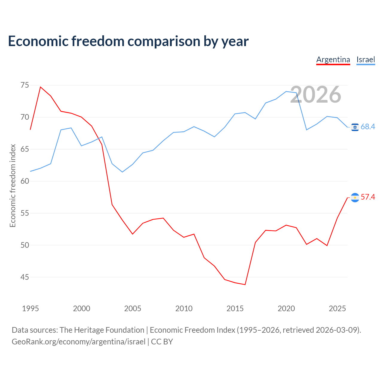 The Economic Freedom Index for Argentina is 57.4, ranking 117/197, compared to 68.4 for Israel, ranking 47/197. The chart above displays a comparison of annual changes in economic freedom indexes.