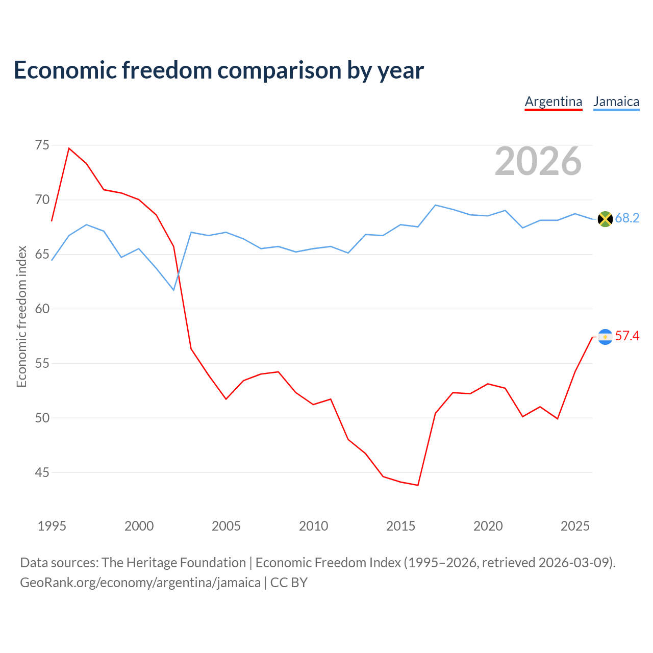 The Economic Freedom Index for Argentina is 57.4, ranking 117/197, compared to 68.2 for Jamaica, ranking 48/197. The chart above displays a comparison of annual changes in economic freedom indexes.