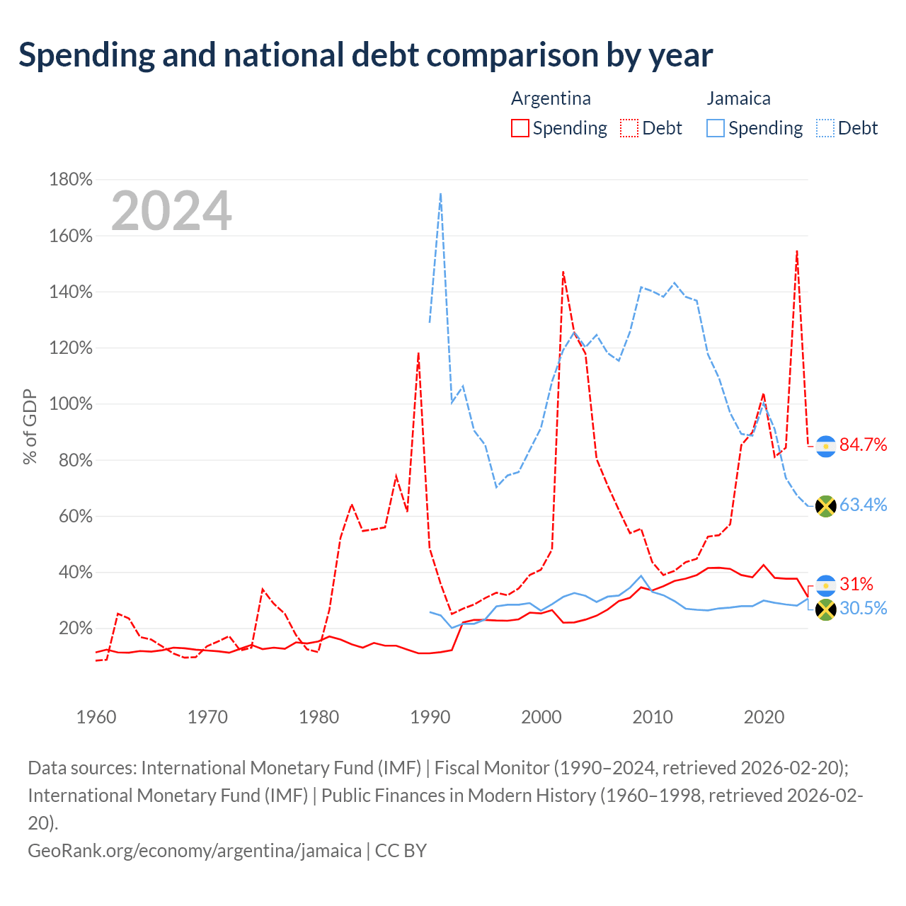Argentina has $540B in government debt (84.7% of GDP), compared to $14B (63.4% of GDP) in Jamaica.
