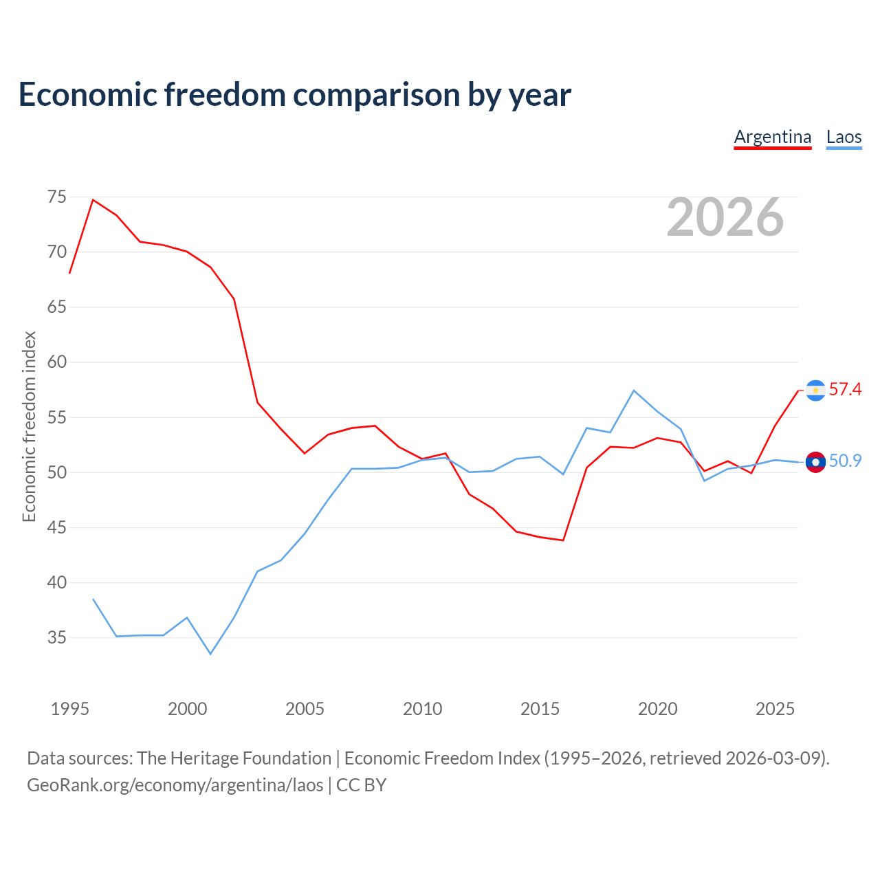 The Economic Freedom Index for Argentina is 57.4, ranking 117/197, compared to 50.9 for Laos, ranking 157/197. The chart above displays a comparison of annual changes in economic freedom indexes.