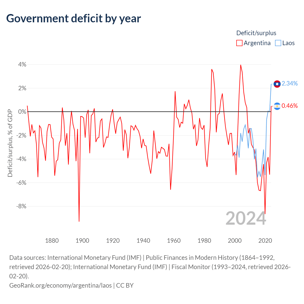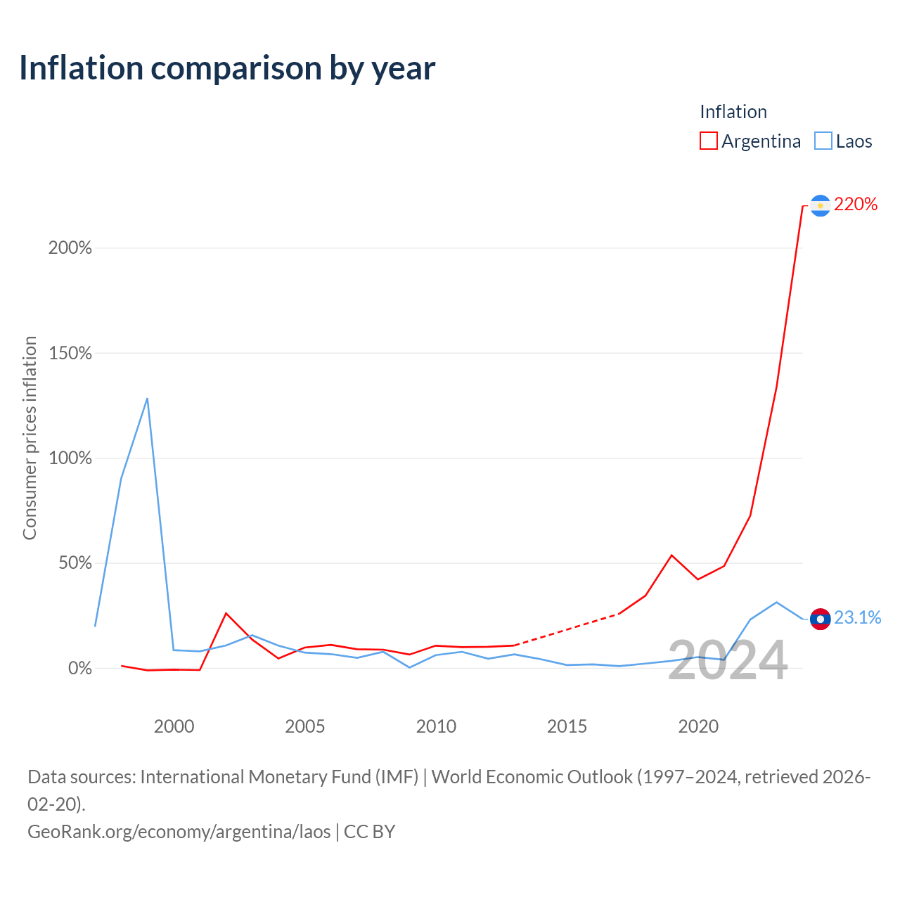 Argentina has a GDP of $638B compared to $16.5B for Laos, ranking 24/197 and 139/197 by economy size, respectively.