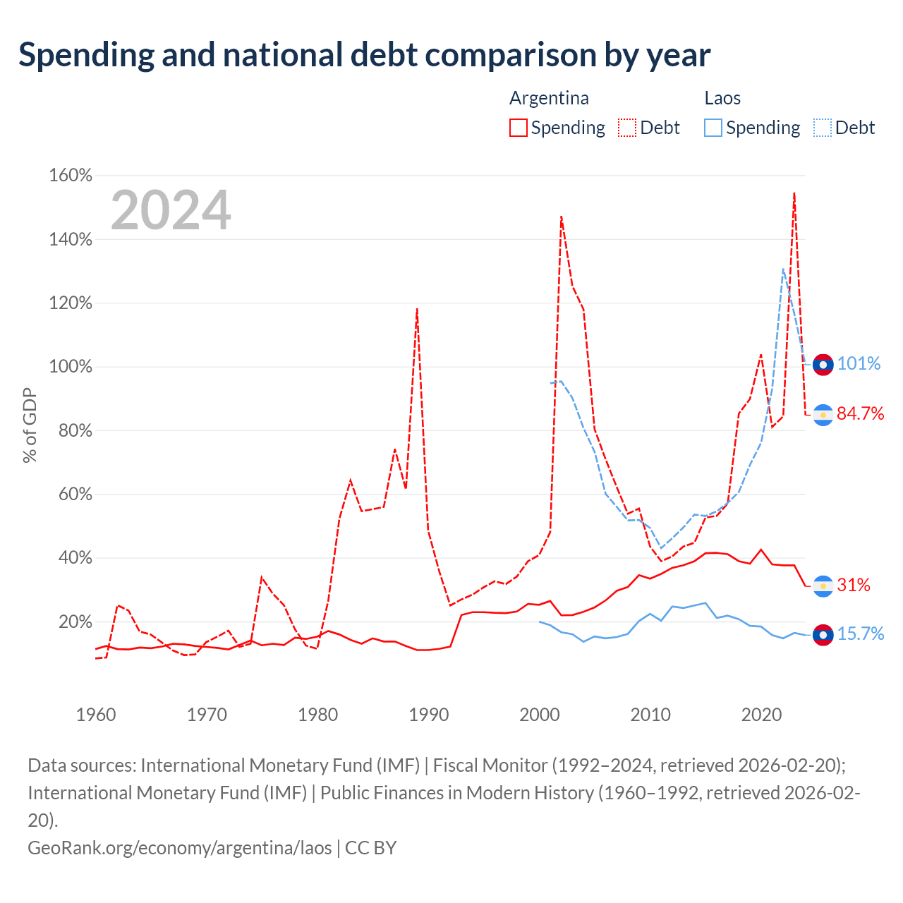 Argentina has $540B in government debt (84.7% of GDP), compared to $16.6B (100.5% of GDP) in Laos.