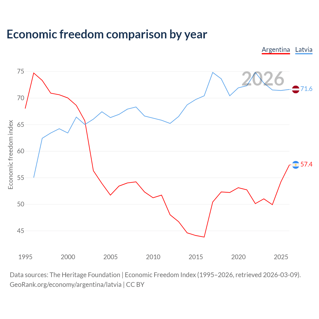 The Economic Freedom Index for Argentina is 57.4, ranking 117/197, compared to 71.6 for Latvia, ranking 31/197. The chart above displays a comparison of annual changes in economic freedom indexes.