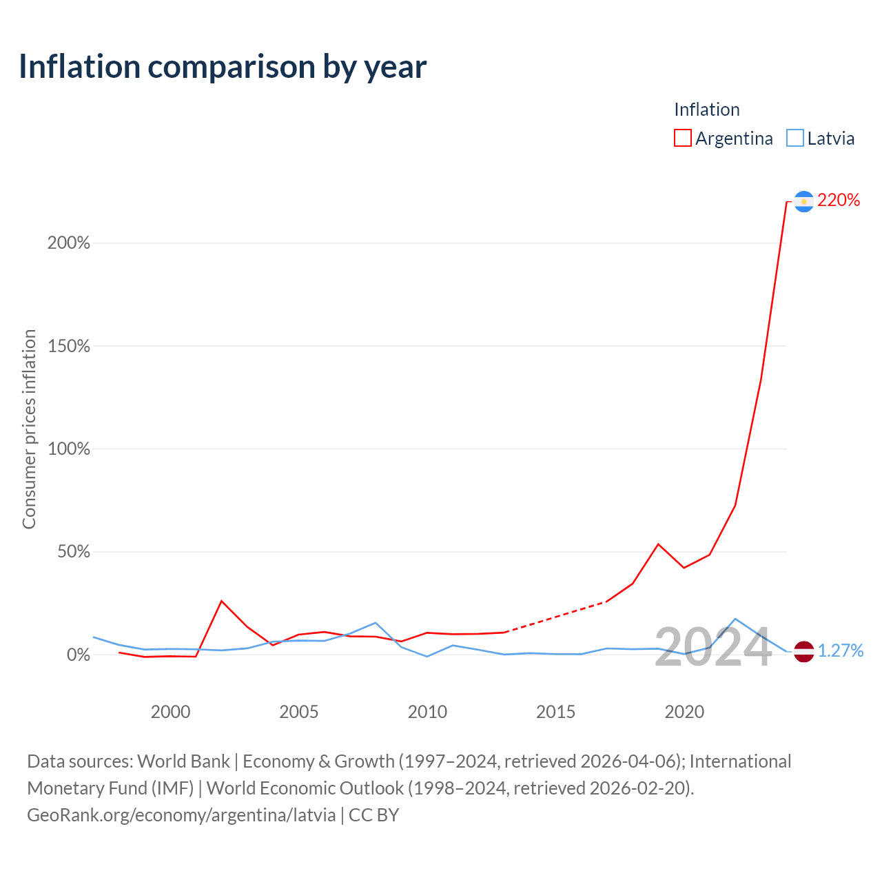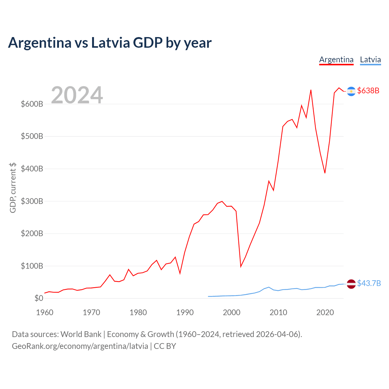 Argentina has a GDP of $638B compared to $43.7B for Latvia, ranking 24/197 and 99/197 by economy size, respectively.
