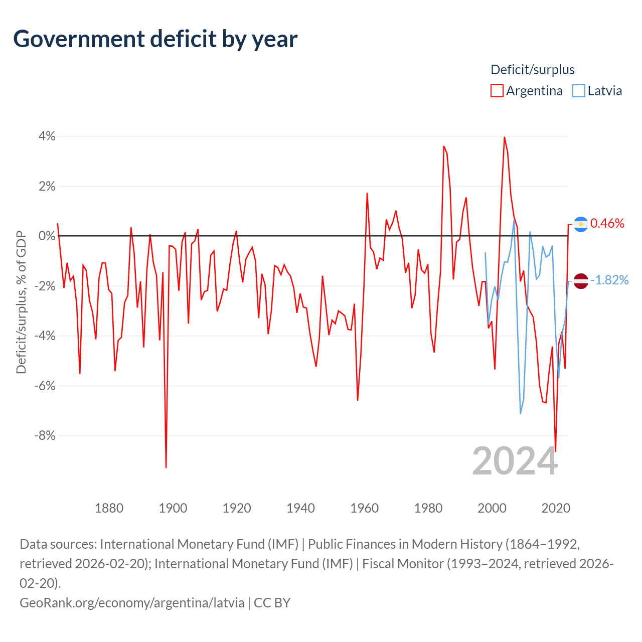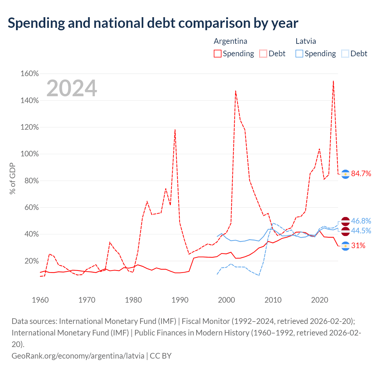 Argentina has $540B in government debt (84.7% of GDP), compared to $20.4B (46.8% of GDP) in Latvia.