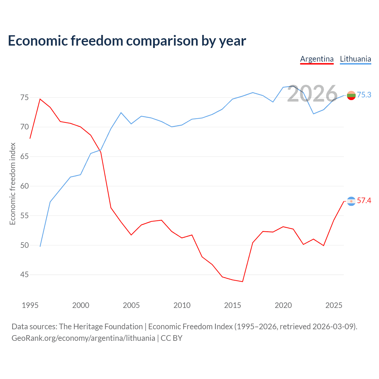 The Economic Freedom Index for Argentina is 57.4, ranking 117/197, compared to 75.3 for Lithuania, ranking 18/197. The chart above displays a comparison of annual changes in economic freedom indexes.