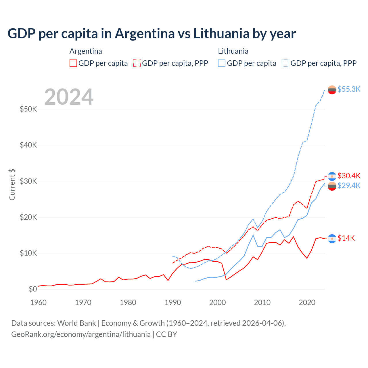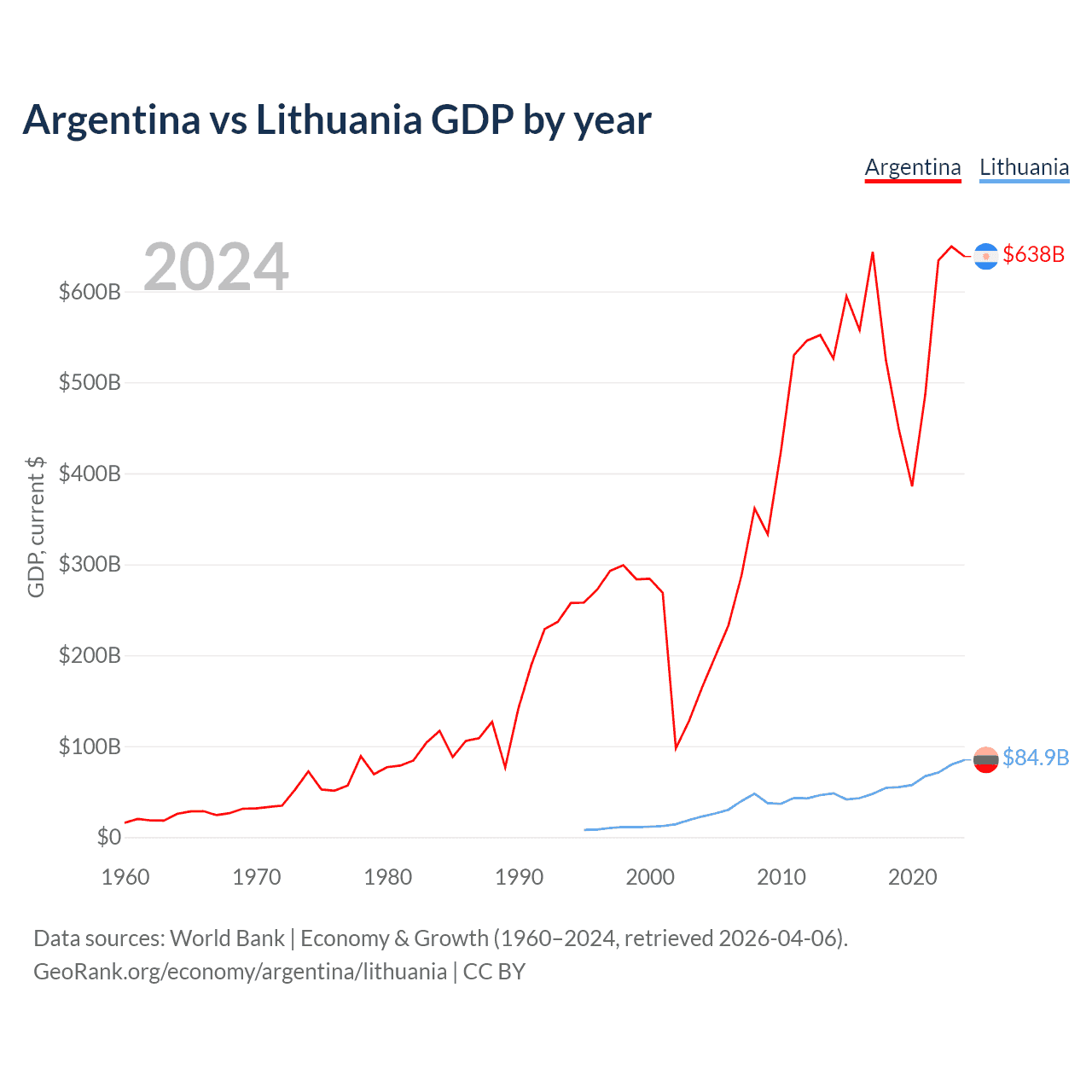Argentina has a GDP of $638B compared to $84.9B for Lithuania, ranking 24/197 and 79/197 by economy size, respectively.
