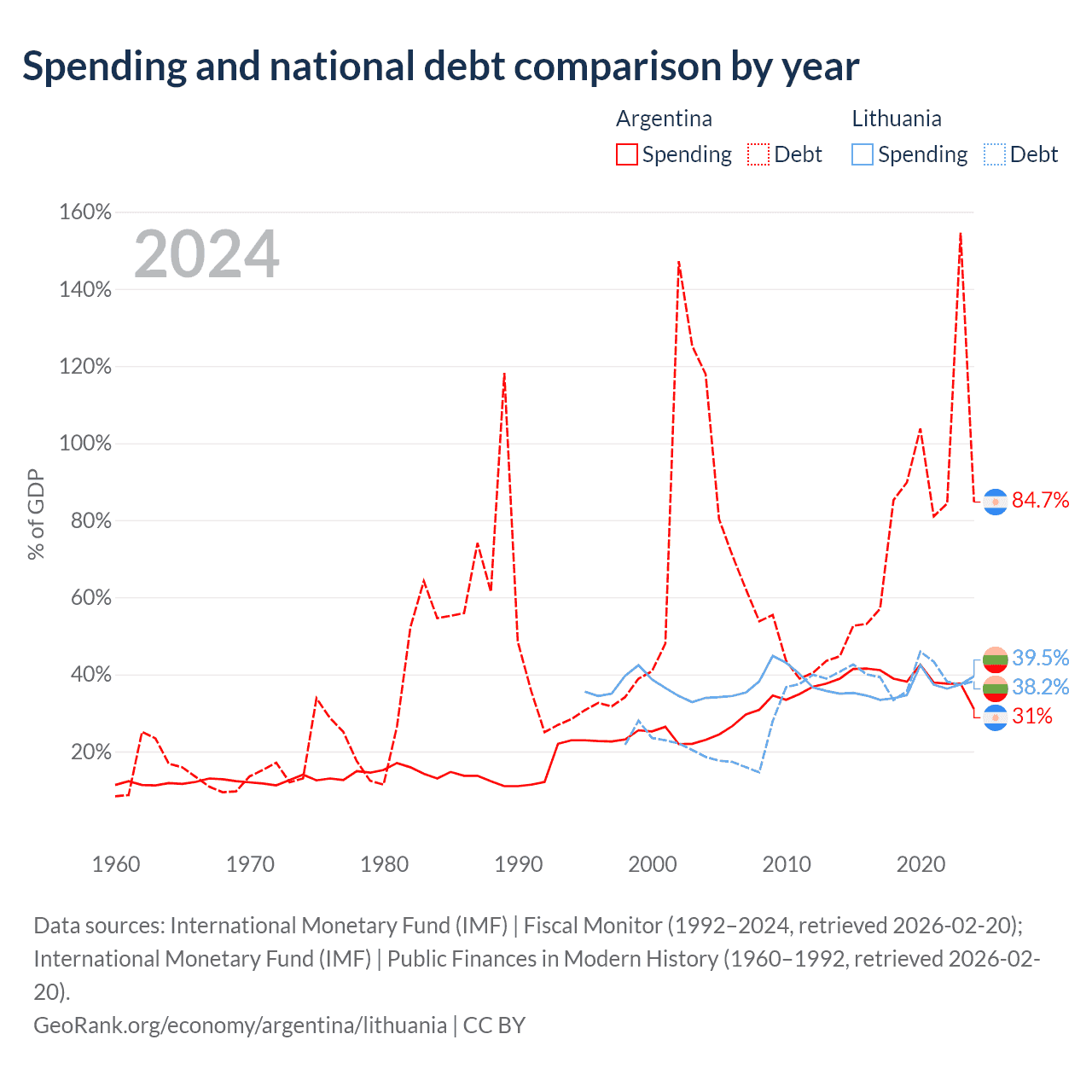 Argentina has $540B in government debt (84.7% of GDP), compared to $32.4B (38.2% of GDP) in Lithuania.