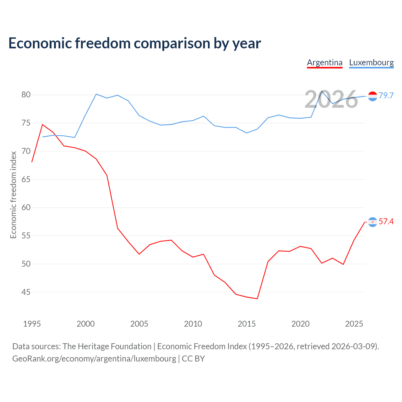 The Economic Freedom Index for Argentina is 57.4, ranking 117/197, compared to 79.7 for Luxembourg, ranking 7/197. The chart above displays a comparison of annual changes in economic freedom indexes.