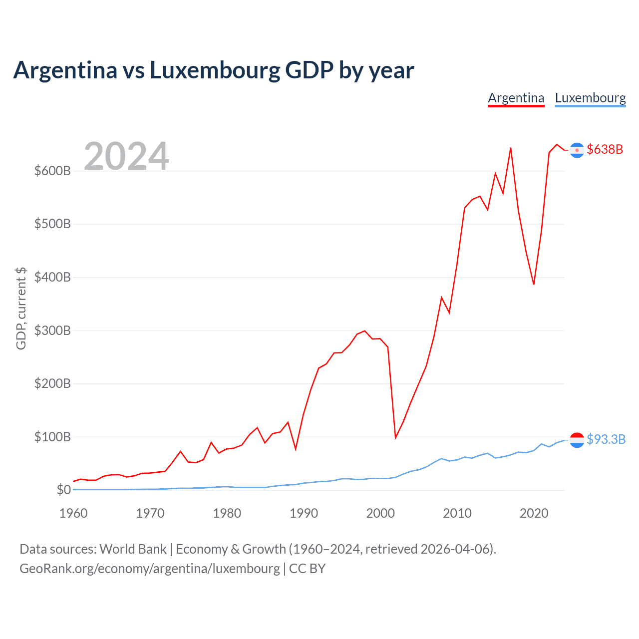 Argentina has a GDP of $638B compared to $93.3B for Luxembourg, ranking 24/197 and 74/197 by economy size, respectively.