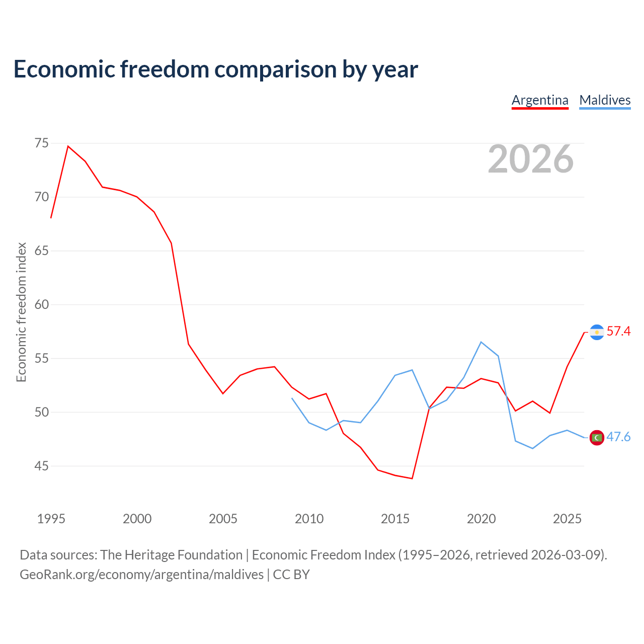 The Economic Freedom Index for Argentina is 57.4, ranking 117/197, compared to 47.6 for Maldives, ranking 174/197. The chart above displays a comparison of annual changes in economic freedom indexes.