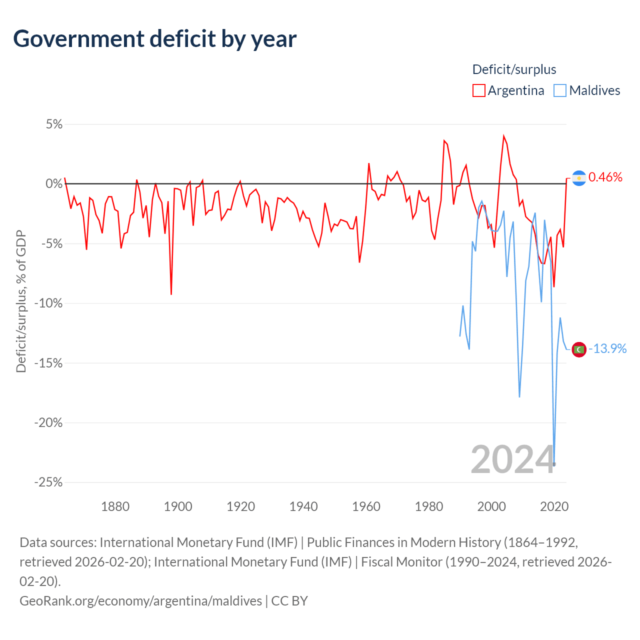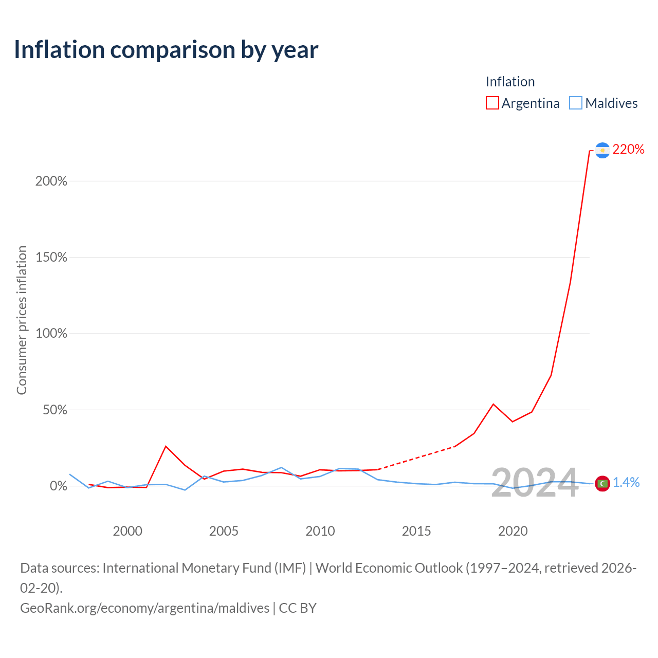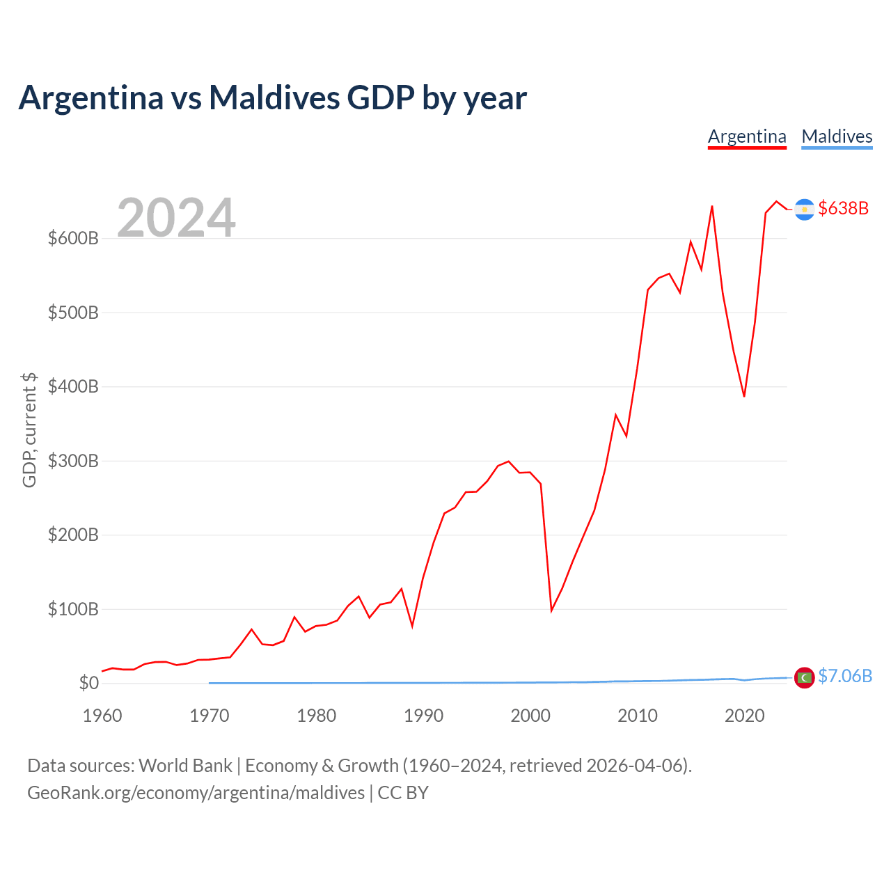 Argentina has a GDP of $638B compared to $7.06B for Maldives, ranking 24/197 and 159/197 by economy size, respectively.