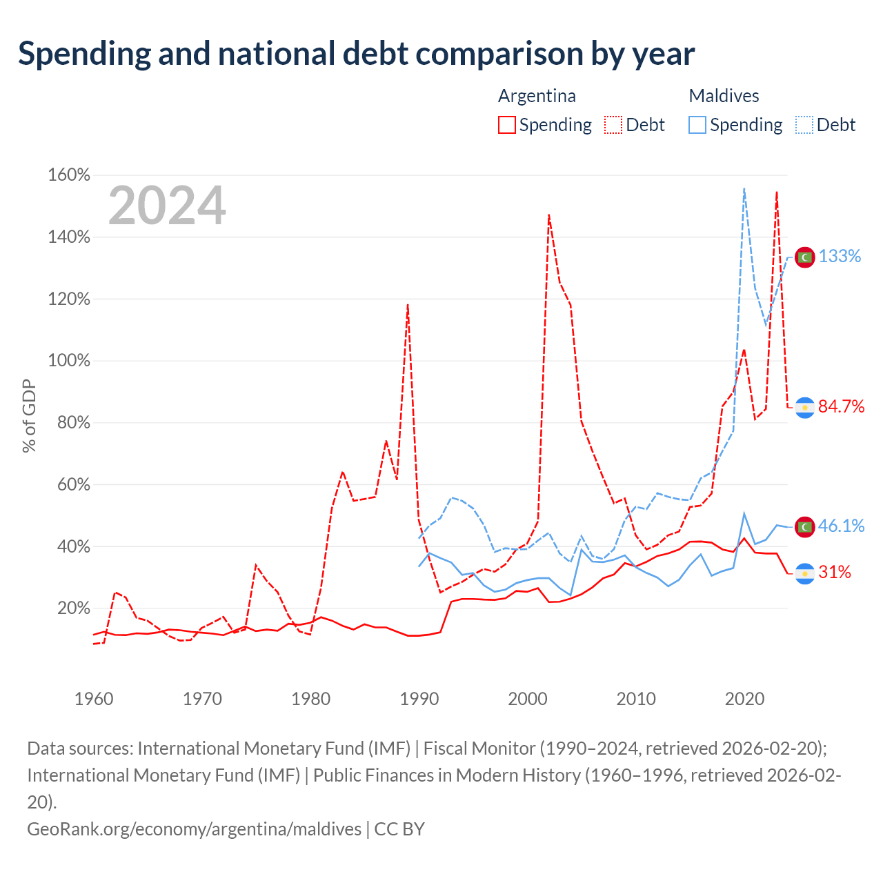 Argentina has $540B in government debt (84.7% of GDP), compared to $9.41B (133.3% of GDP) in Maldives.