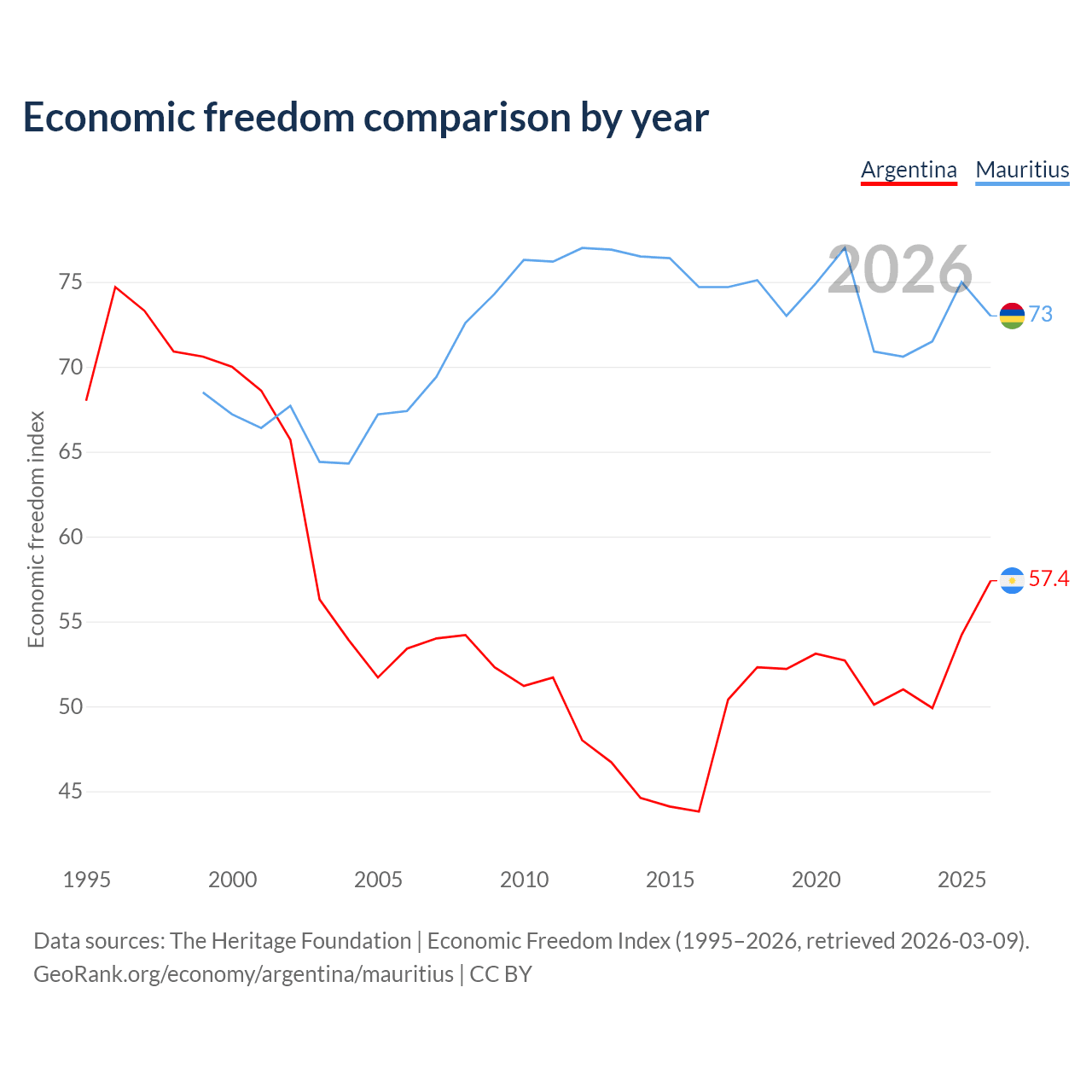 The Economic Freedom Index for Argentina is 57.4, ranking 117/197, compared to 73 for Mauritius, ranking 26/197. The chart above displays a comparison of annual changes in economic freedom indexes.