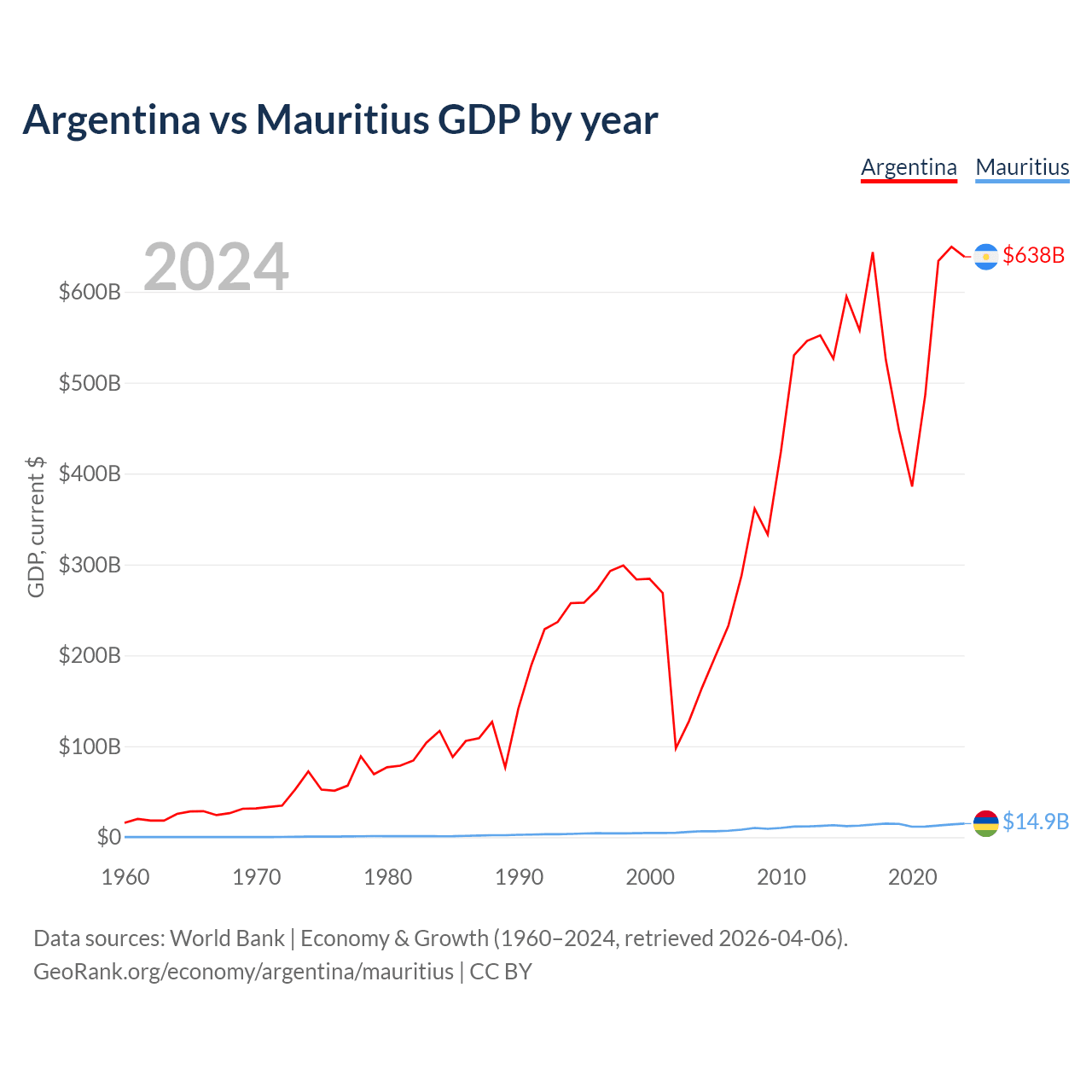 Argentina has a GDP of $638B compared to $14.9B for Mauritius, ranking 24/197 and 143/197 by economy size, respectively.