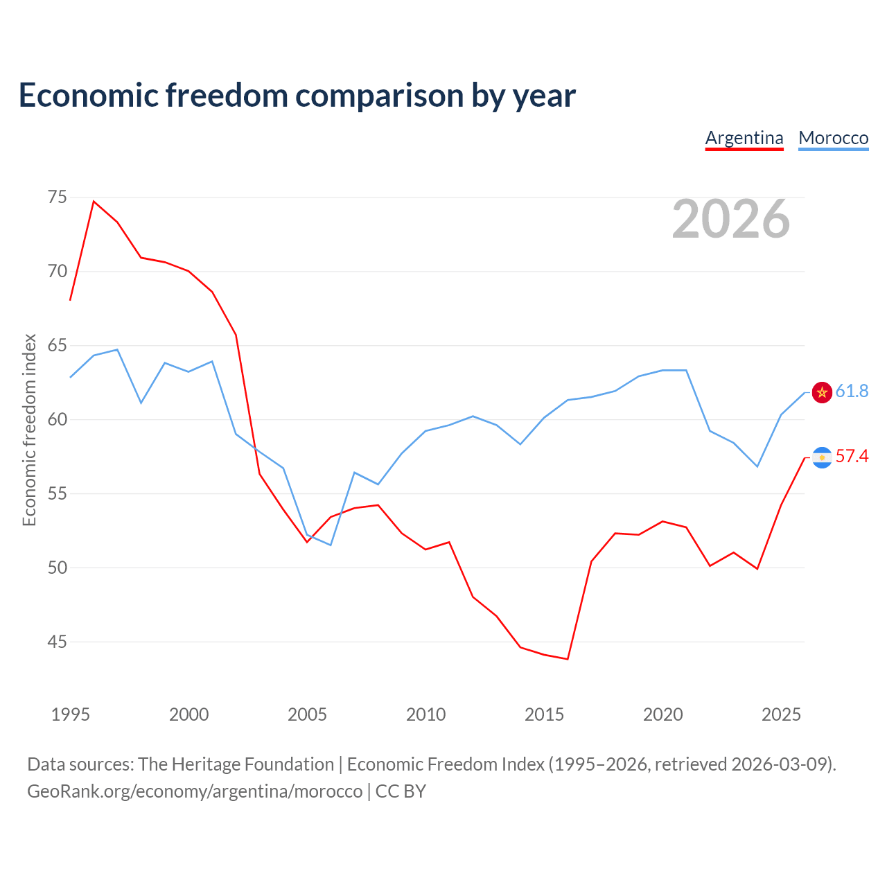 The Economic Freedom Index for Argentina is 57.4, ranking 117/197, compared to 61.8 for Morocco, ranking 91/197. The chart above displays a comparison of annual changes in economic freedom indexes.