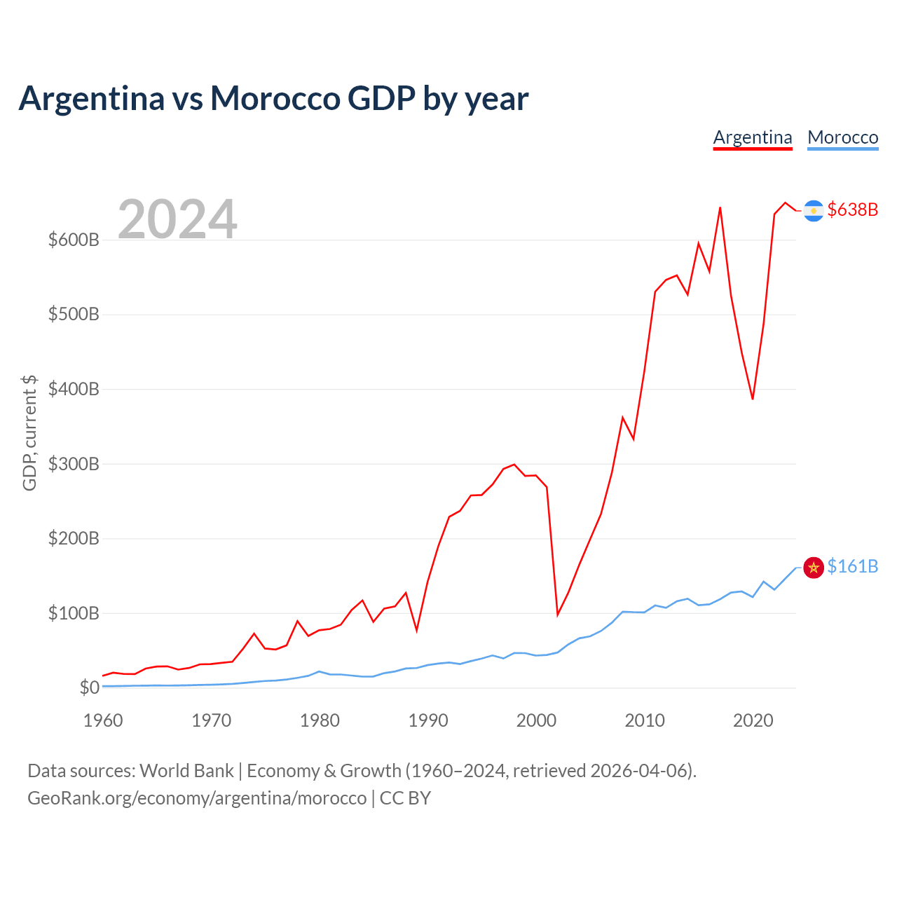 Argentina has a GDP of $638B compared to $161B for Morocco, ranking 24/197 and 58/197 by economy size, respectively.