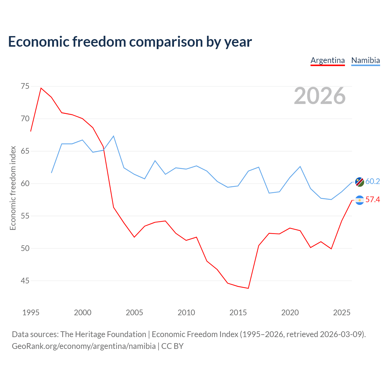 The Economic Freedom Index for Argentina is 57.4, ranking 117/197, compared to 60.2 for Namibia, ranking 95/197. The chart above displays a comparison of annual changes in economic freedom indexes.