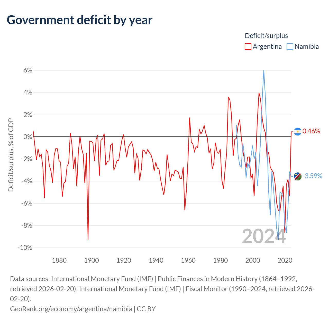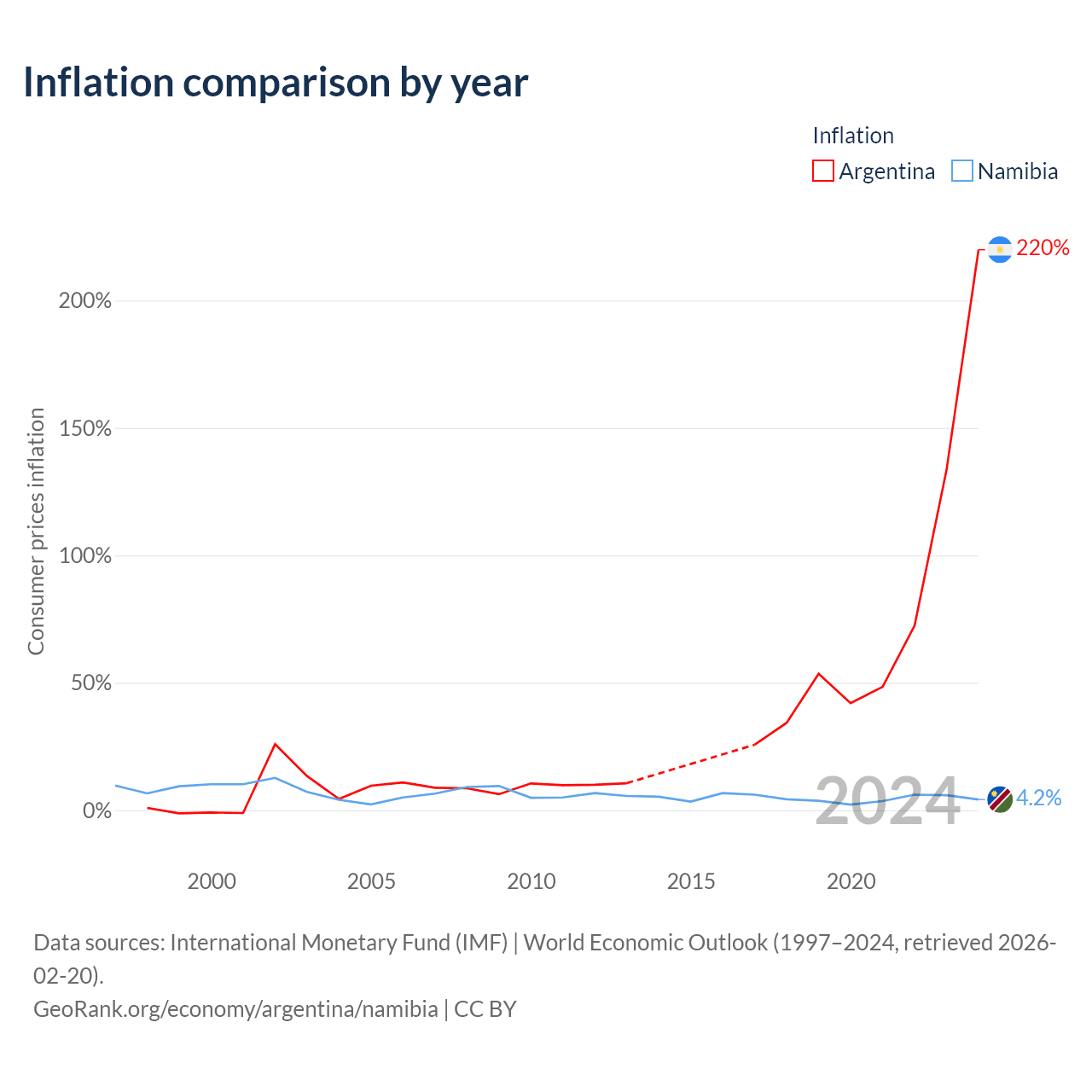 Argentina has a GDP of $638B compared to $13.4B for Namibia, ranking 24/197 and 147/197 by economy size, respectively.