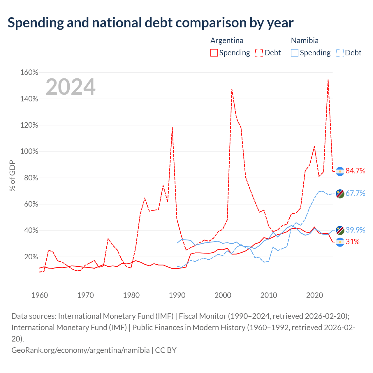 Argentina has $540B in government debt (84.7% of GDP), compared to $9.05B (67.7% of GDP) in Namibia.