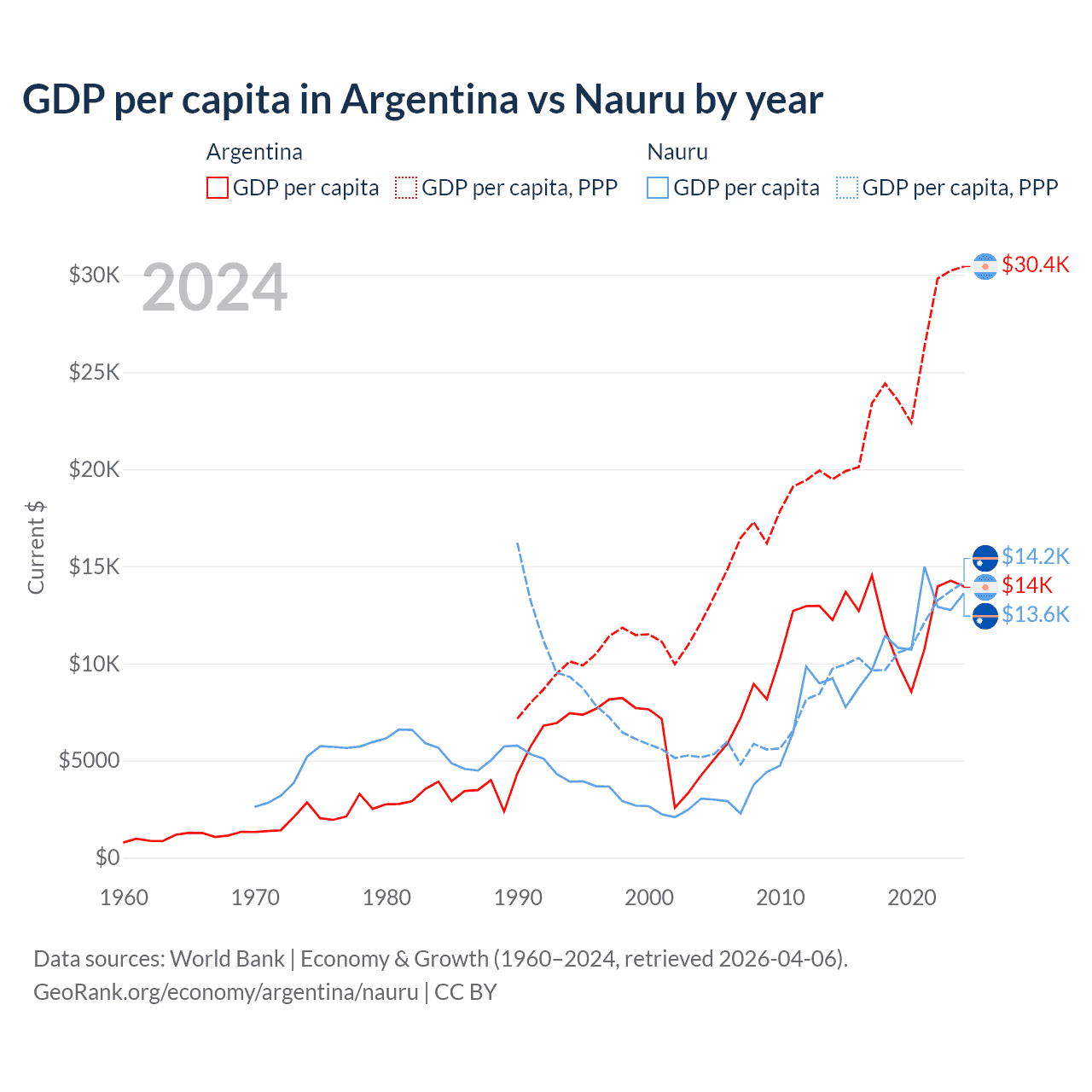 GDP per capita in Argentina vs Nauru by year