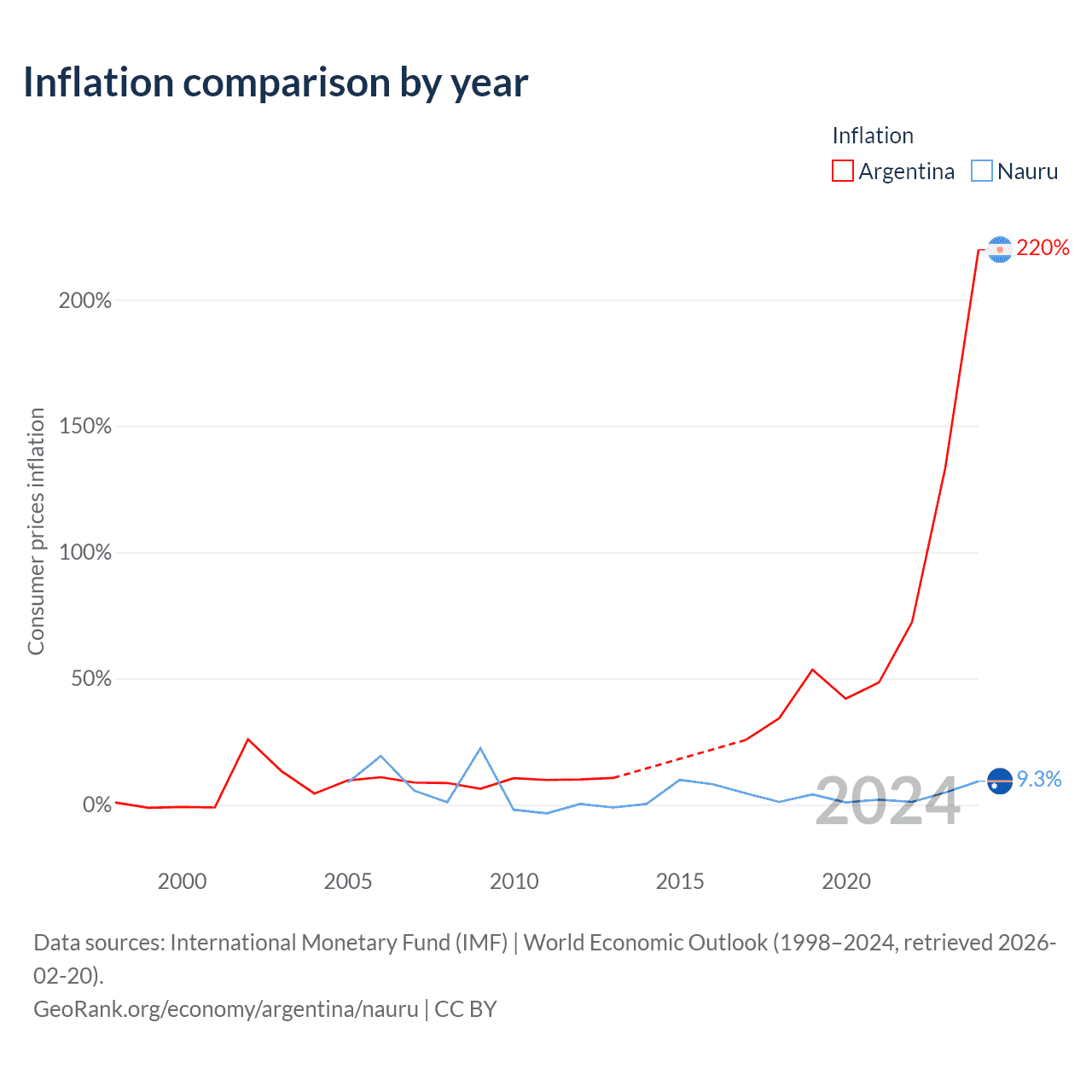 Over the past 20 years, Argentina has recorded an average annual inflation rate of 42%, compared with 4.84% in Nauru. In 2024, inflation was 219.9% in Argentina and 9.3% in Nauru.