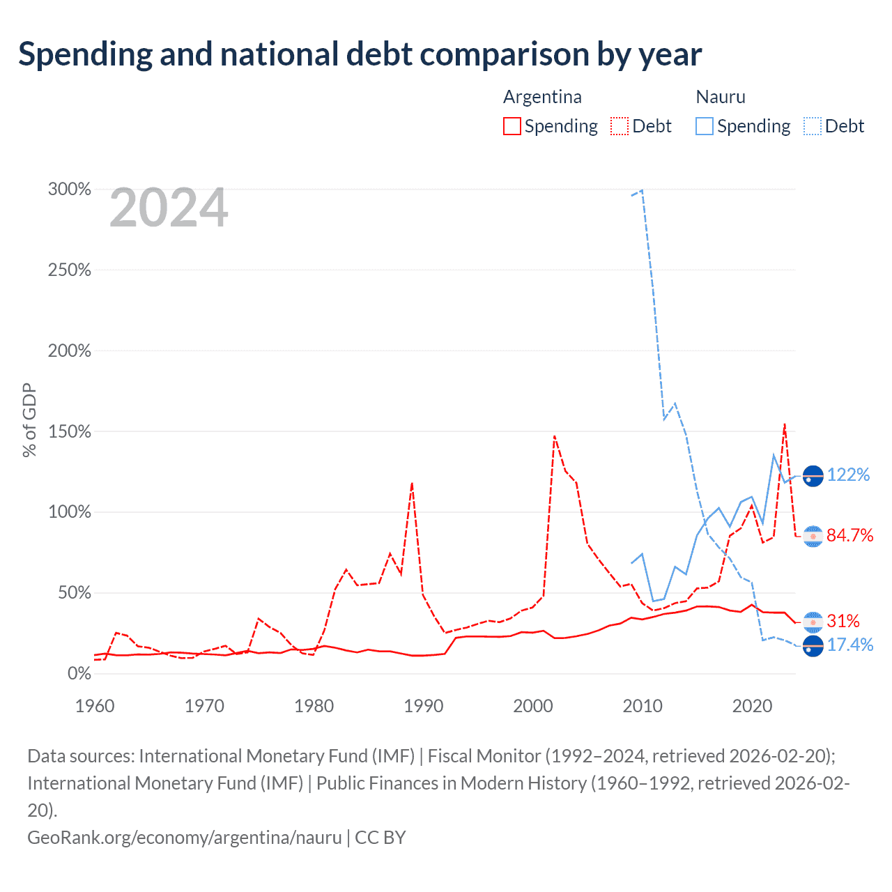 Argentina has $540B in government debt (84.7% of GDP), compared to $28.3M (17.4% of GDP) in Nauru.