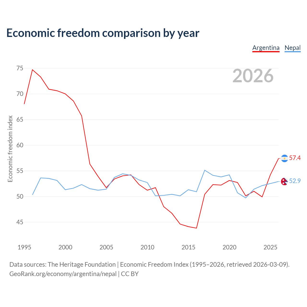 The Economic Freedom Index for Argentina is 57.4, ranking 117/197, compared to 52.9 for Nepal, ranking 144/197. The chart above displays a comparison of annual changes in economic freedom indexes.