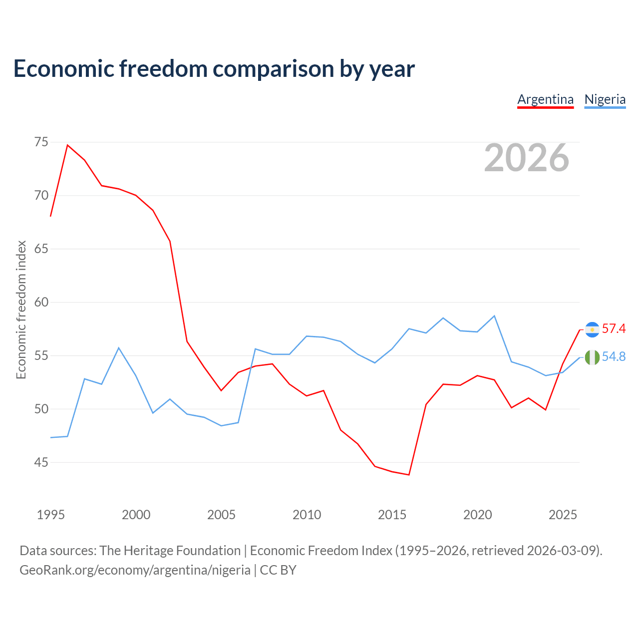 The Economic Freedom Index for Argentina is 57.4, ranking 117/197, compared to 54.8 for Nigeria, ranking 132/197. The chart above displays a comparison of annual changes in economic freedom indexes.
