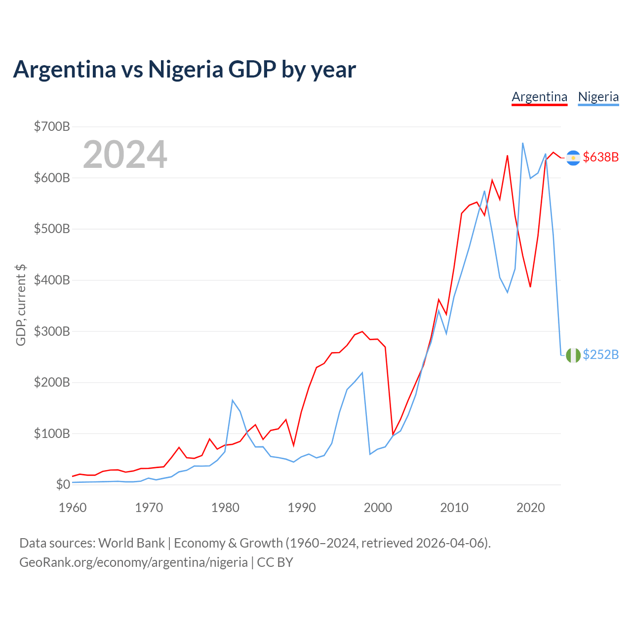 Argentina has a GDP of $638B compared to $252B for Nigeria, ranking 24/197 and 54/197 by economy size, respectively.