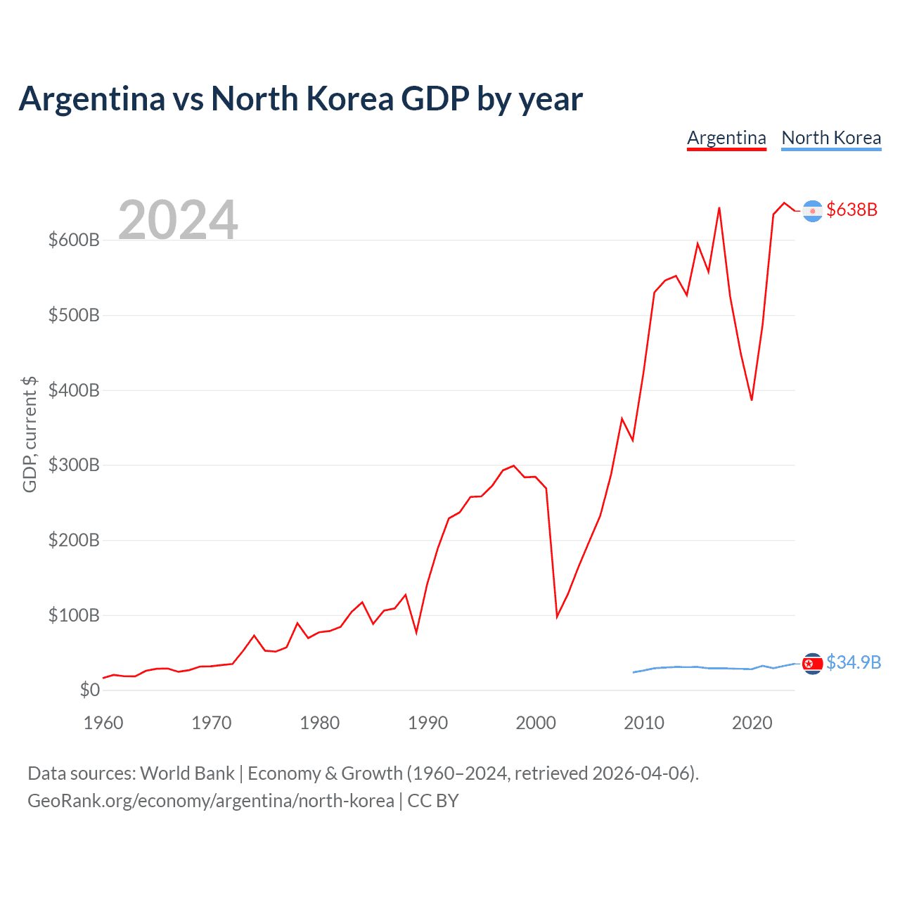 Argentina has a GDP of $638B compared to $34.9B for North Korea, ranking 24/197 and 106/197 by economy size, respectively.