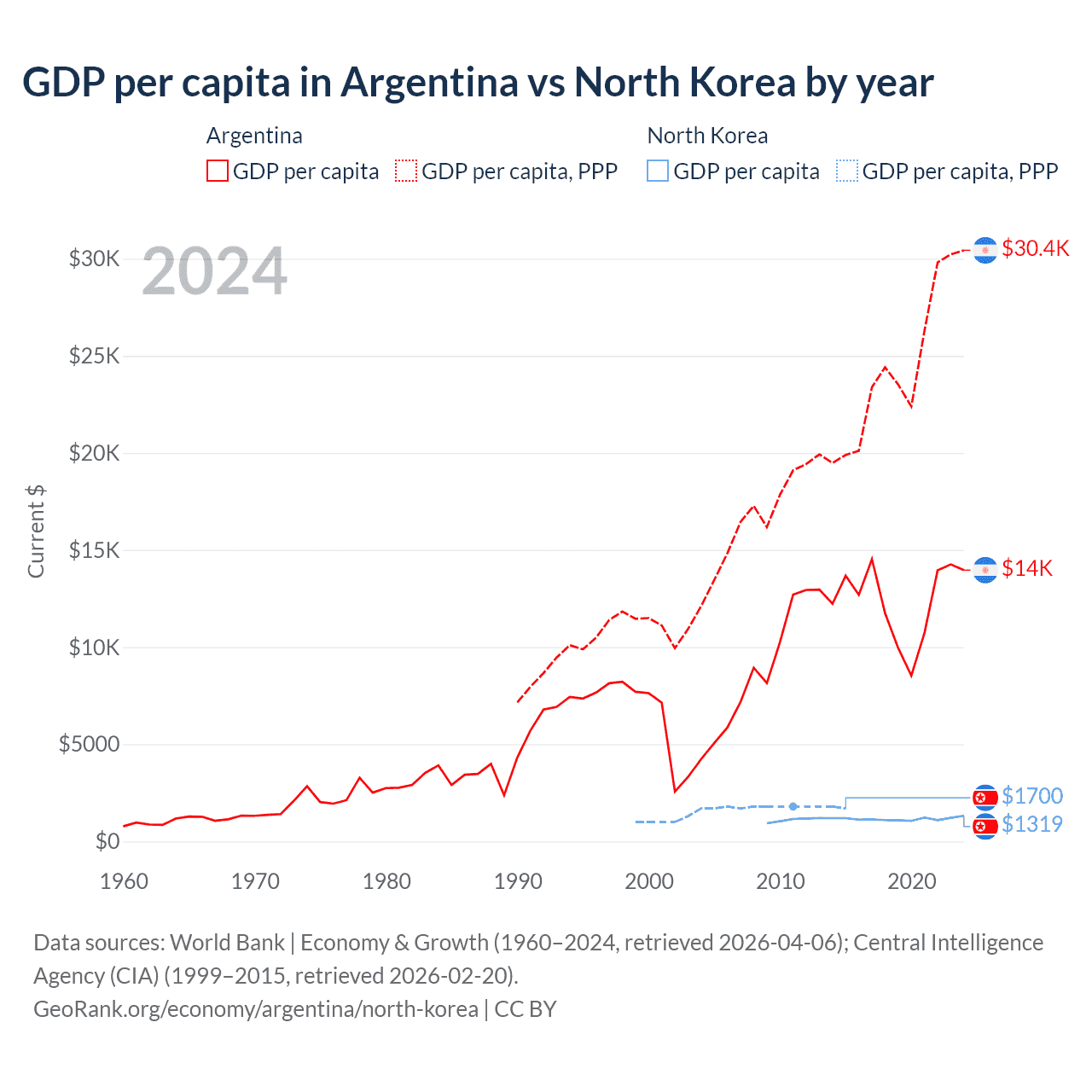 GDP per capita in Argentina vs North Korea by year