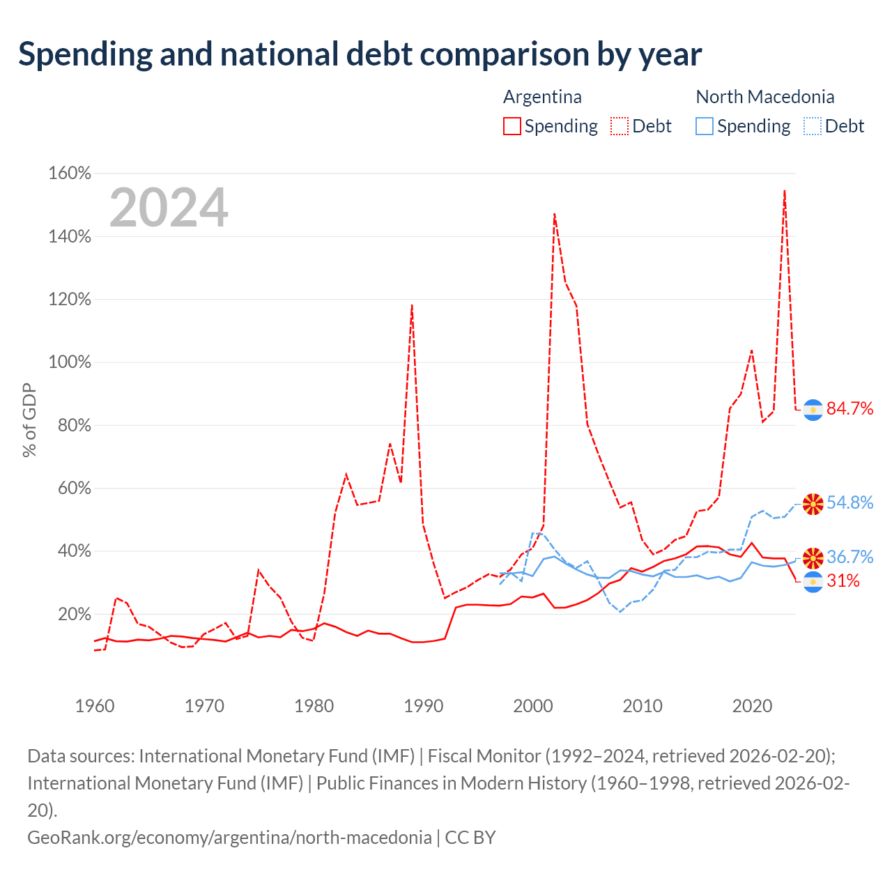 Argentina has $540B in government debt (84.7% of GDP), compared to $9.3B (54.8% of GDP) in North Macedonia.