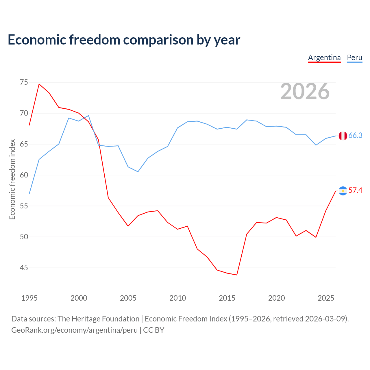 The Economic Freedom Index for Argentina is 57.4, ranking 117/197, compared to 66.3 for Peru, ranking 62/197. The chart above displays a comparison of annual changes in economic freedom indexes.