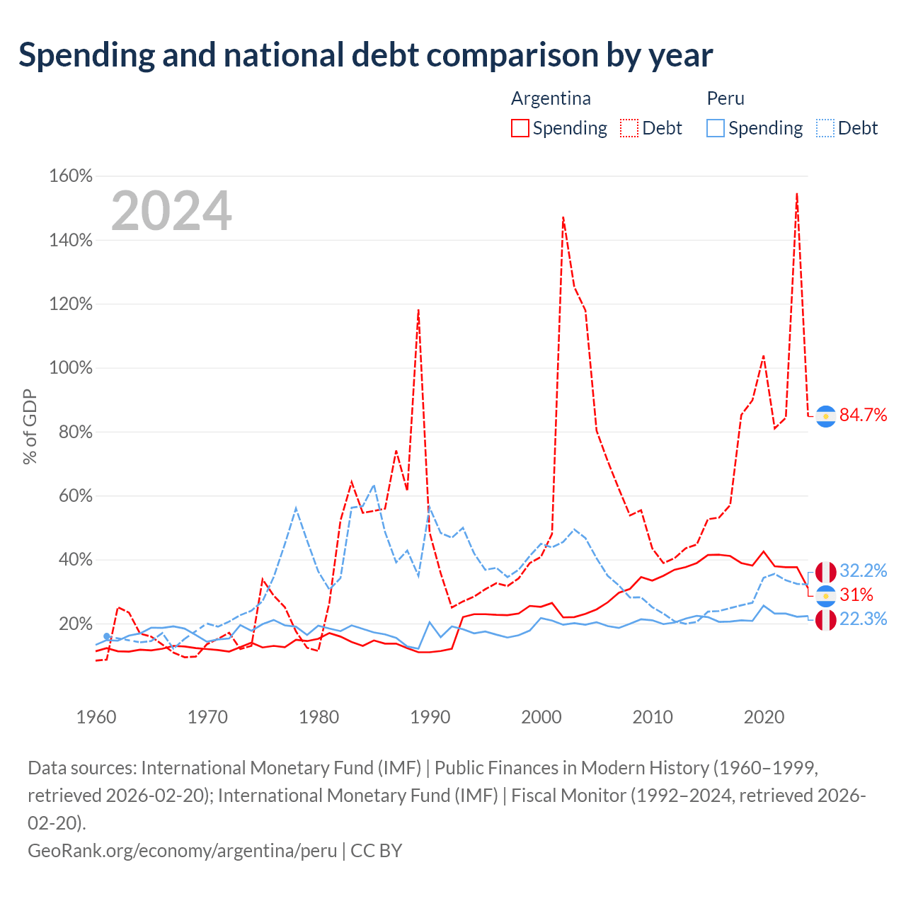 Argentina has $540B in government debt (84.7% of GDP), compared to $93B (32.2% of GDP) in Peru.
