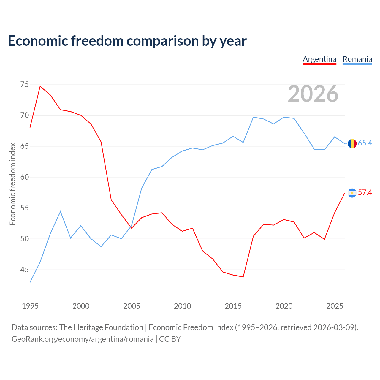The Economic Freedom Index for Argentina is 57.4, ranking 117/197, compared to 65.4 for Romania, ranking 64/197. The chart above displays a comparison of annual changes in economic freedom indexes.