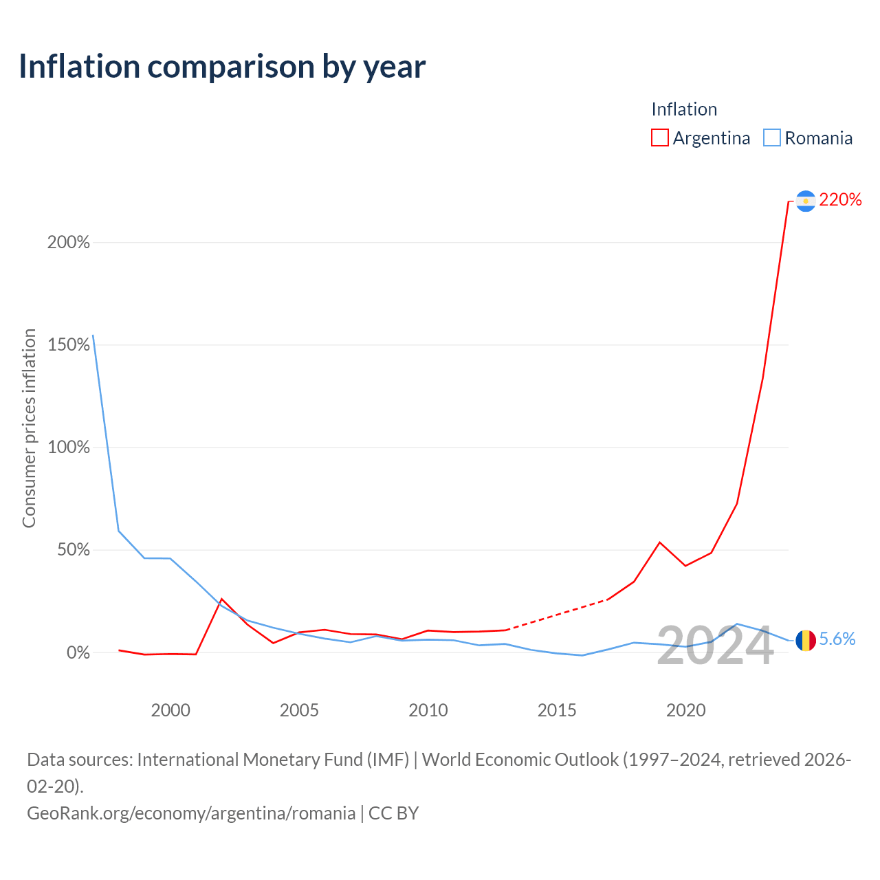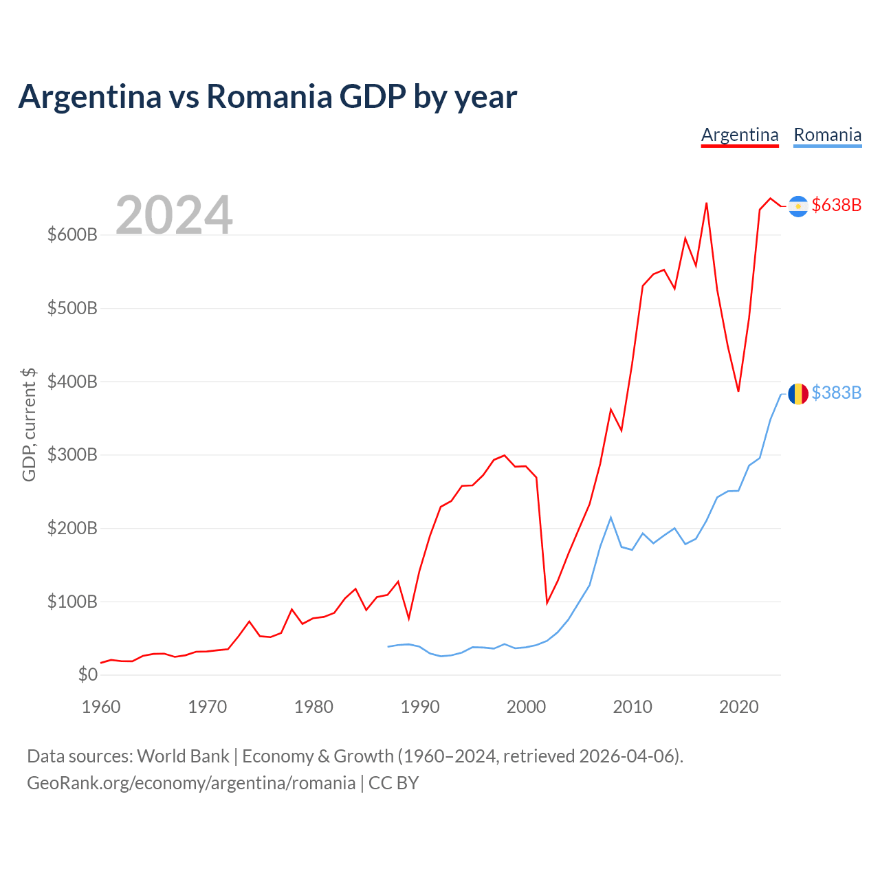 Argentina has a GDP of $638B compared to $383B for Romania, ranking 24/197 and 42/197 by economy size, respectively.