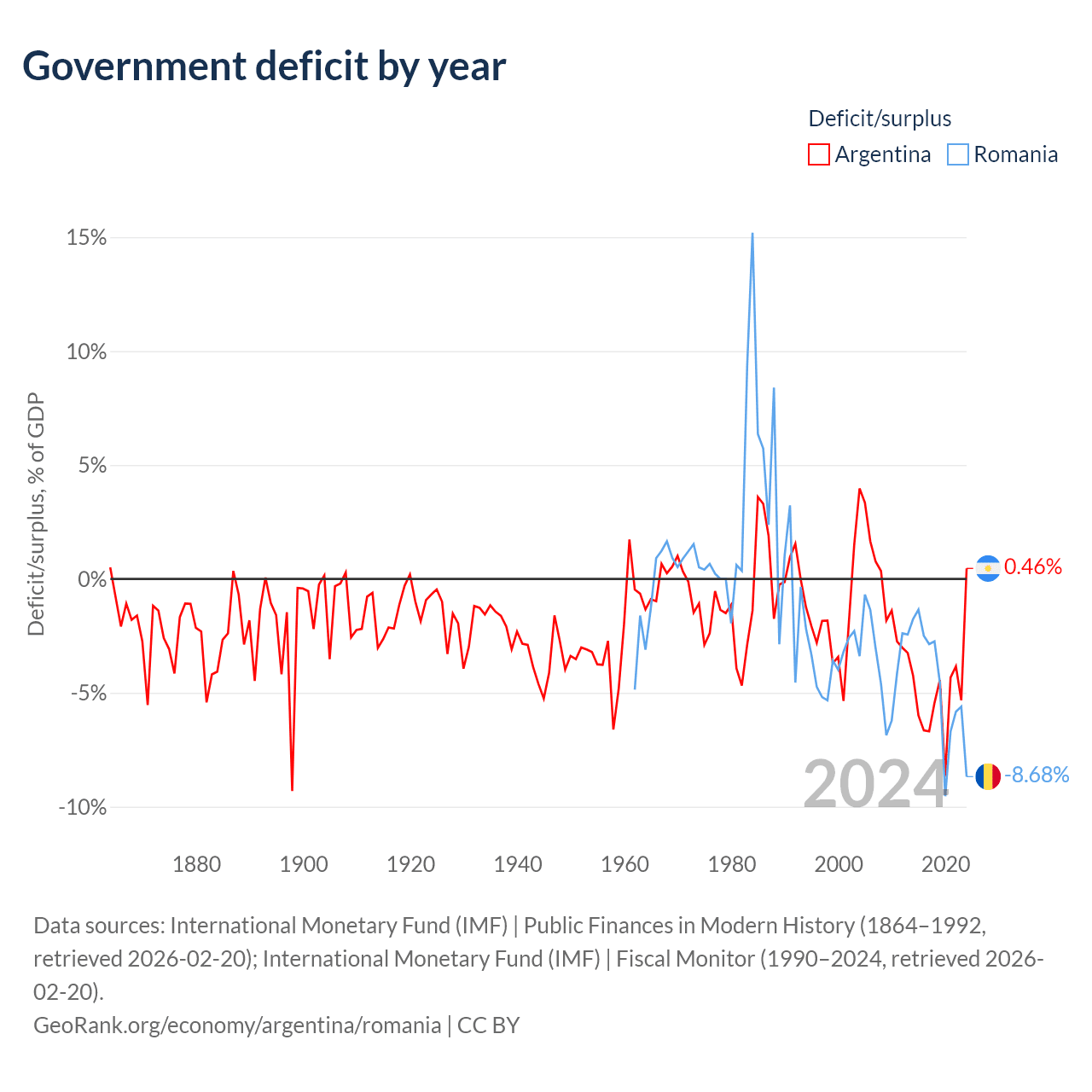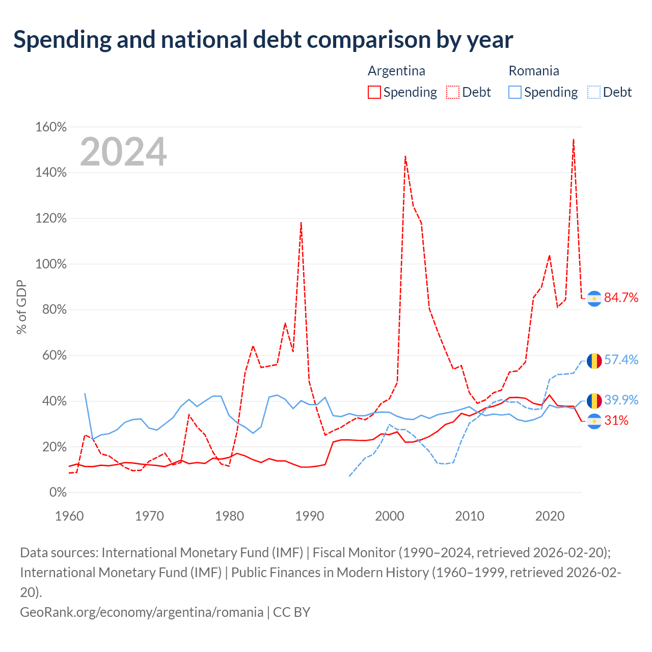 Argentina has $540B in government debt (84.7% of GDP), compared to $220B (57.4% of GDP) in Romania.