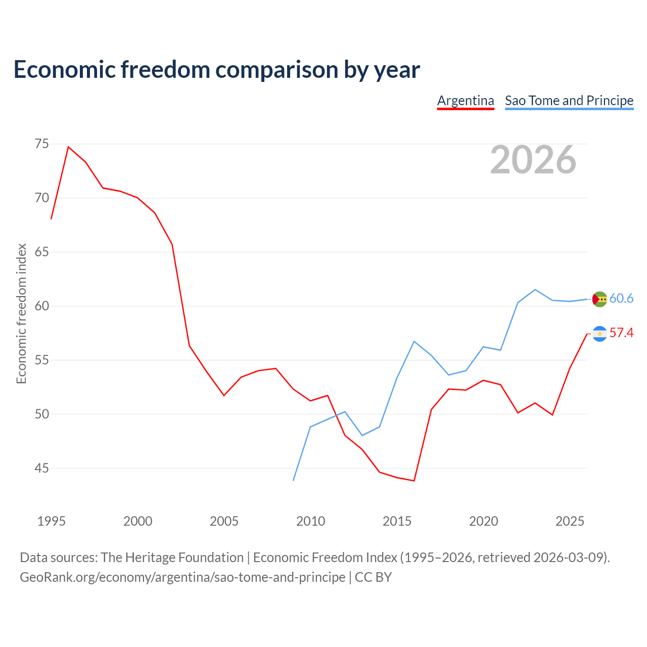 The Economic Freedom Index for Argentina is 57.4, ranking 117/197, compared to 60.6 for Sao Tome and Principe, ranking 93/197. The chart above displays a comparison of annual changes in economic freedom indexes.