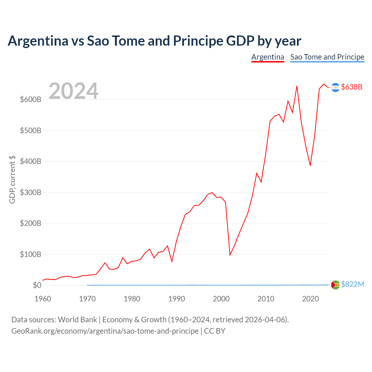 Argentina has a GDP of $638B compared to $822M for Sao Tome and Principe, ranking 24/197 and 189/197 by economy size, respectively.