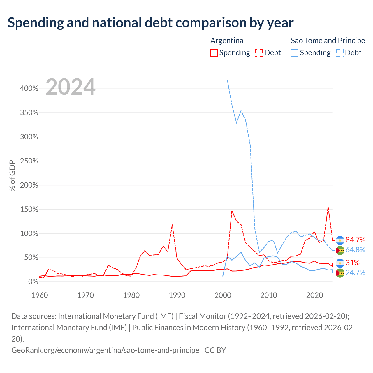 Argentina has $540B in government debt (84.7% of GDP), compared to $533M (64.8% of GDP) in Sao Tome and Principe.